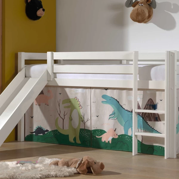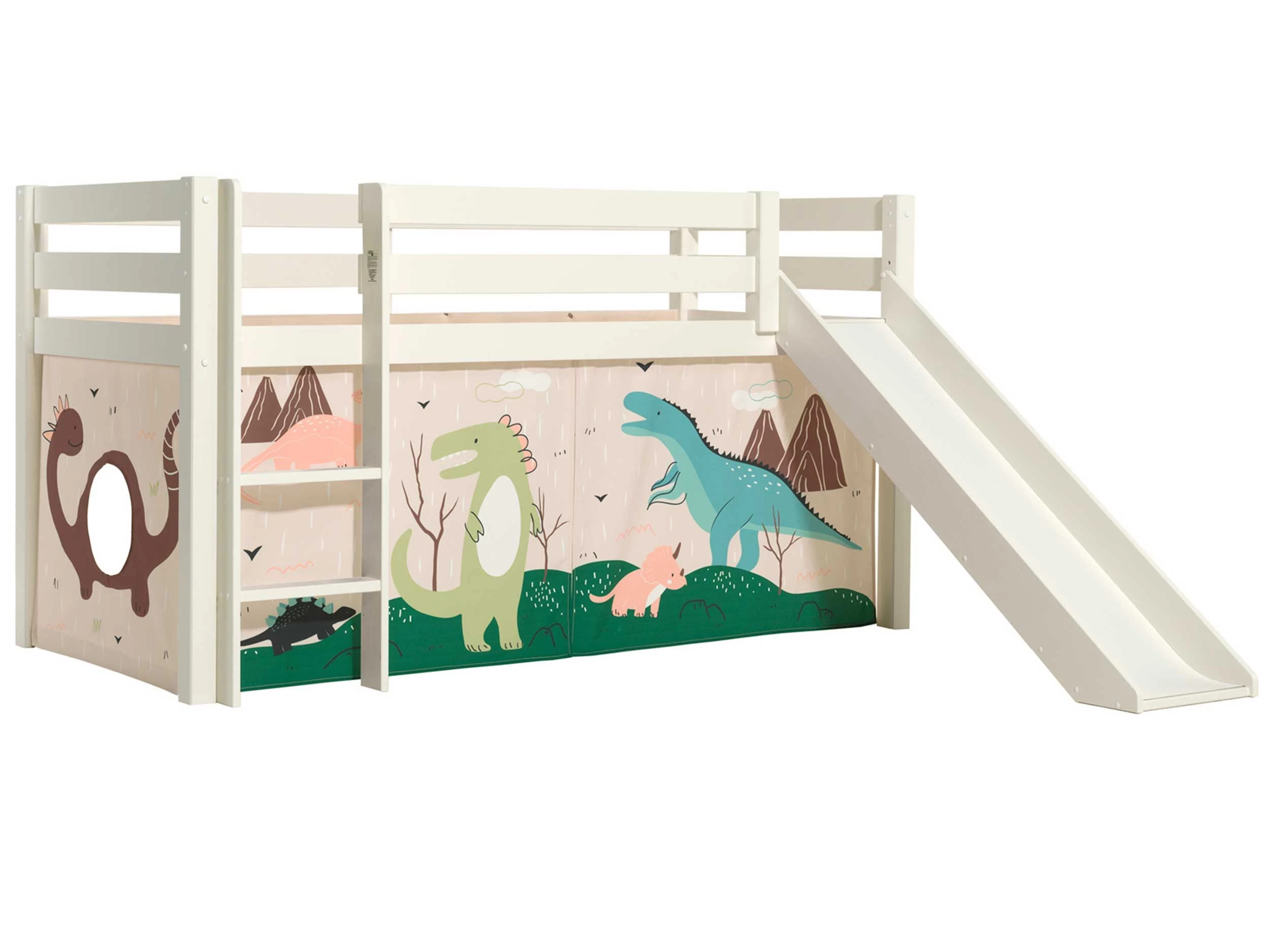 Cet ensemble se compose du lit mi-hauteur Astrid avec toboggan et de la tente de lit Dino. Le lit mi-hauteur Astrid est fabriquée en bois de pin laqué et convient à un matelas de 90 cm sur 200 cm. Ce lit mi-hauteur stable a des pieds de 6,5 x 6,5 cm. Le lit convient aux enfants à partir de 6 ans et comporte une échelle droite avec de larges marches et un toboggan. La tente de lit Dino en coton est imprimée de différents dinosaures. Cela transforme la chambre des enfants en un paradis du jeu aventureux !