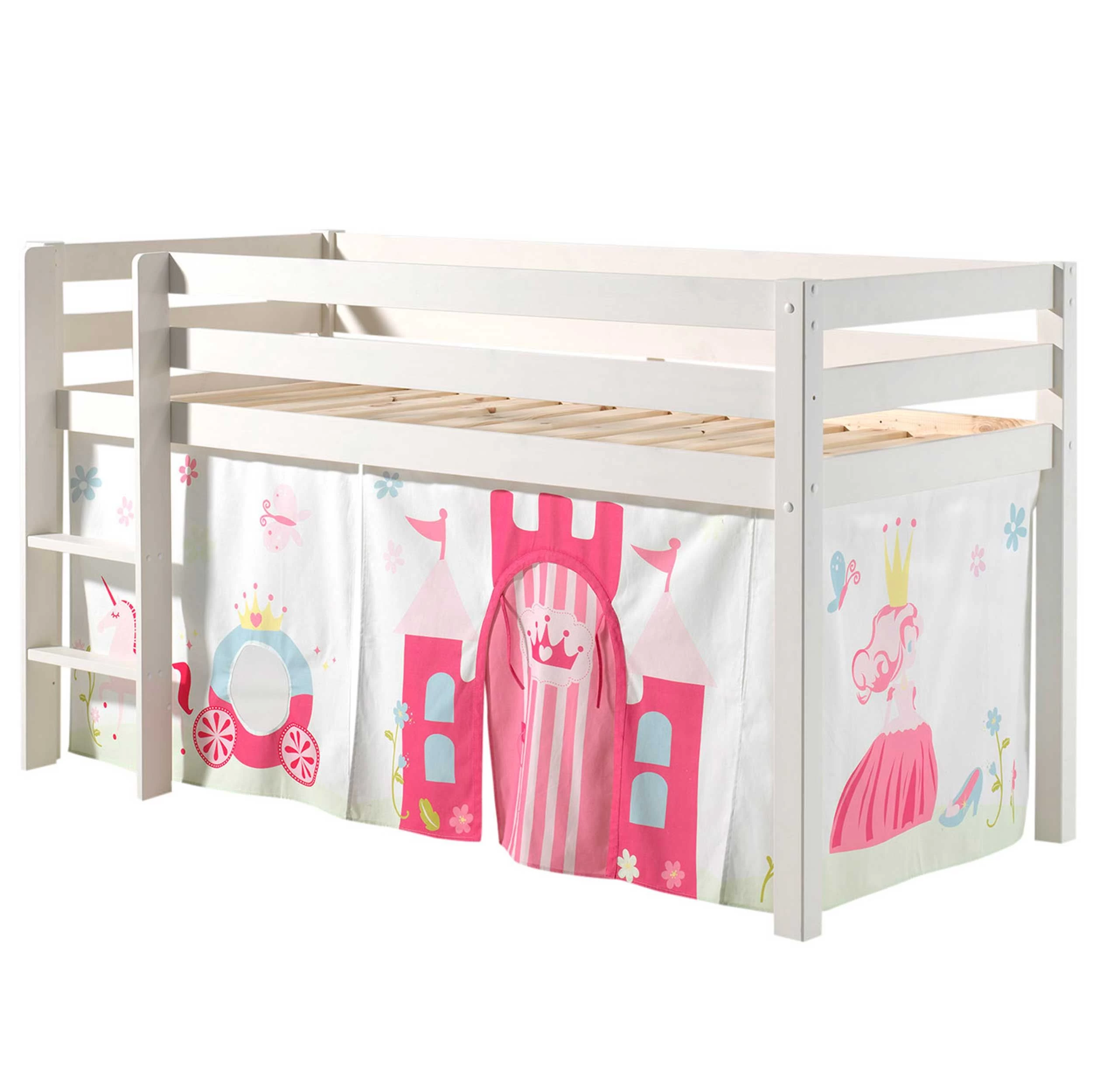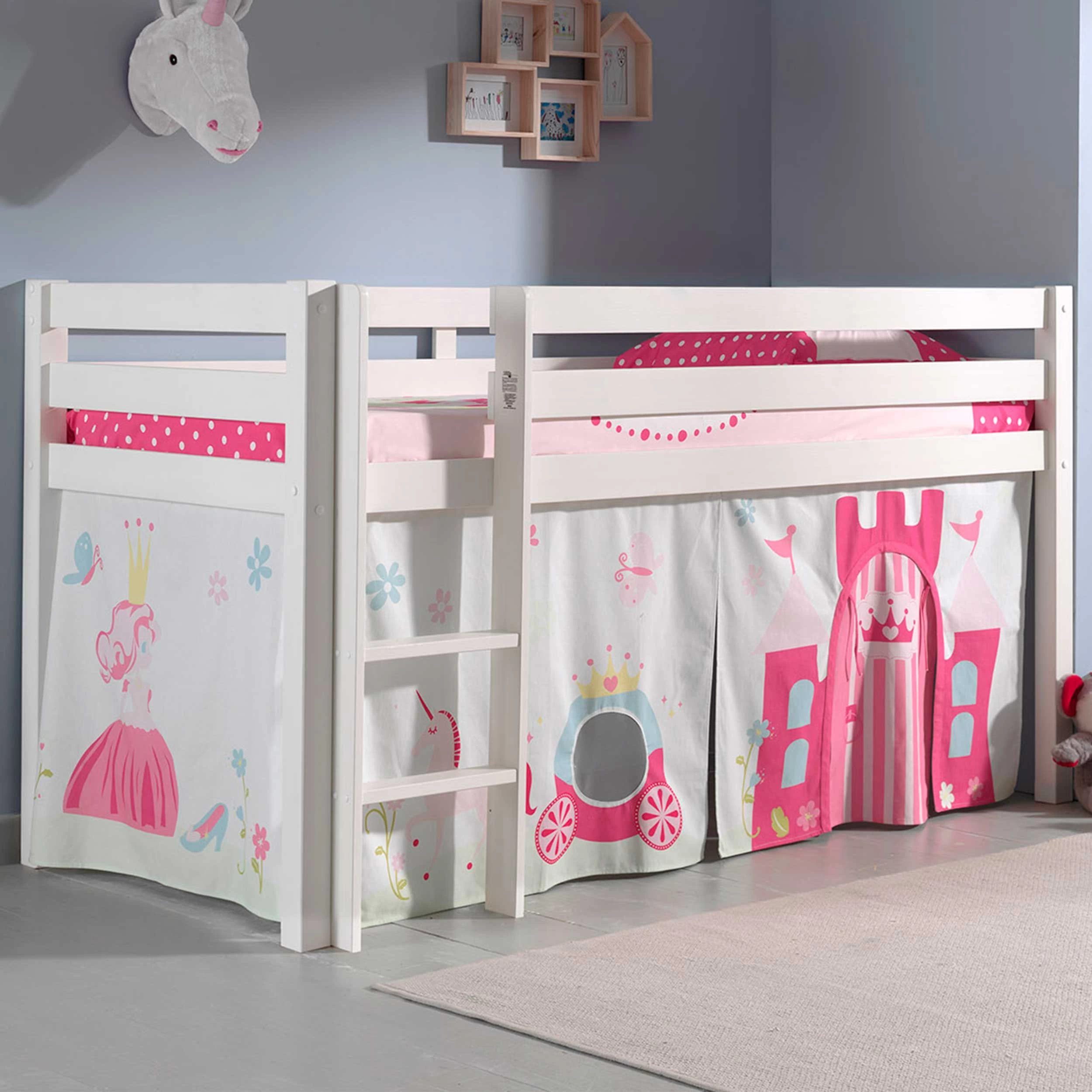 Fabriqué en pin massif laqué blanc, ce lit mi-hauteur Charlotte est équipé d’une tente de lit sous le thème de princesses. Les pieds de lit ont une épaisseur de 6,5 x 6,5 cm, garantissant la stabilité du lit. Le lit mi-hauteur Astrid s’adapte à un matelas de 90×200 cm. Nous vous conseillons d’opter pour notre matelas Confort. Le sommier à lattes est compris.