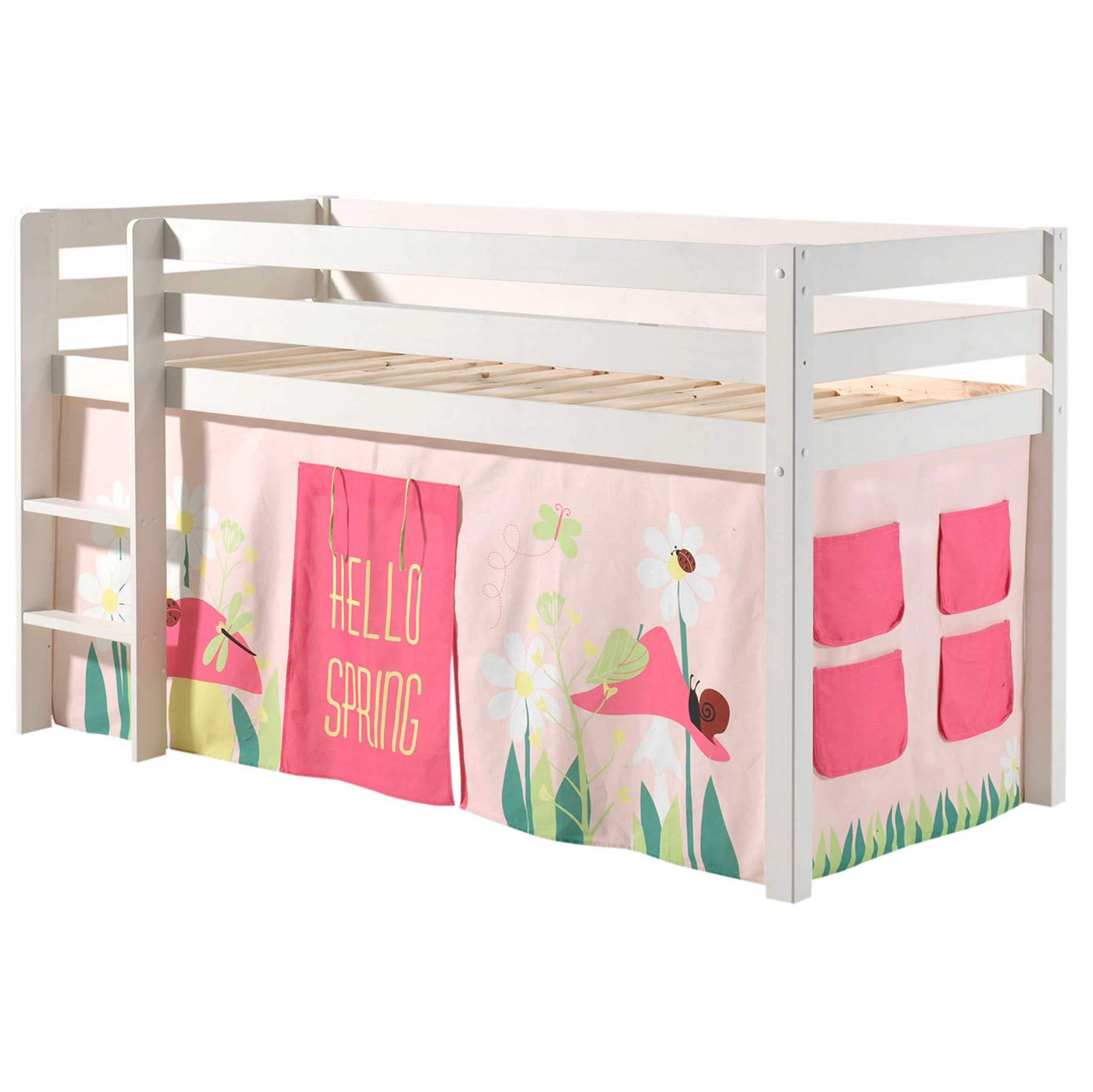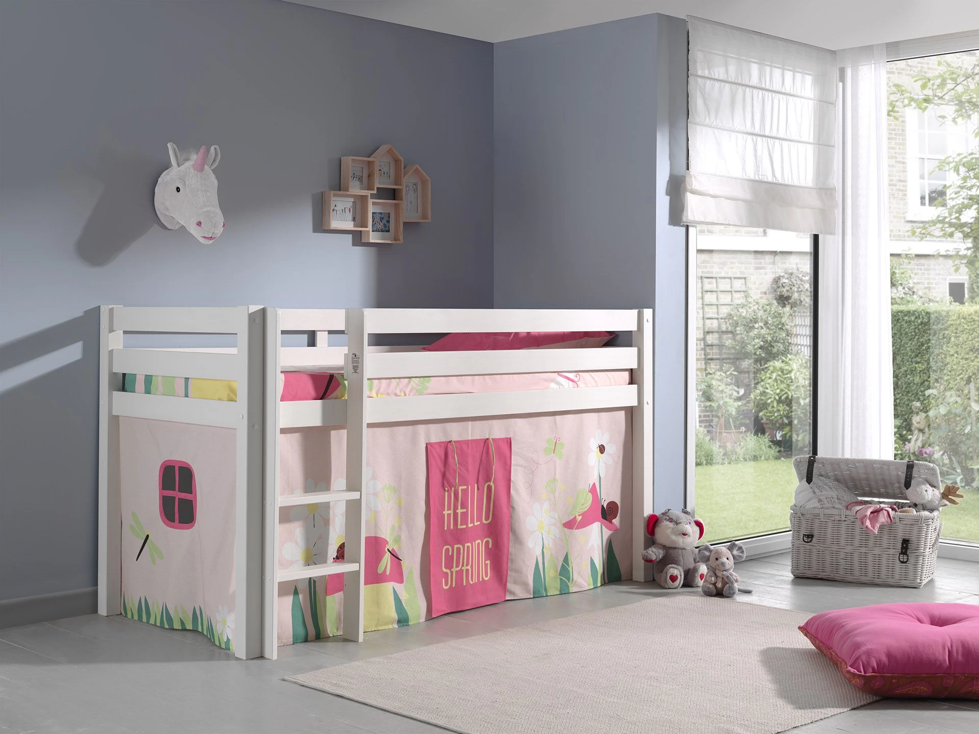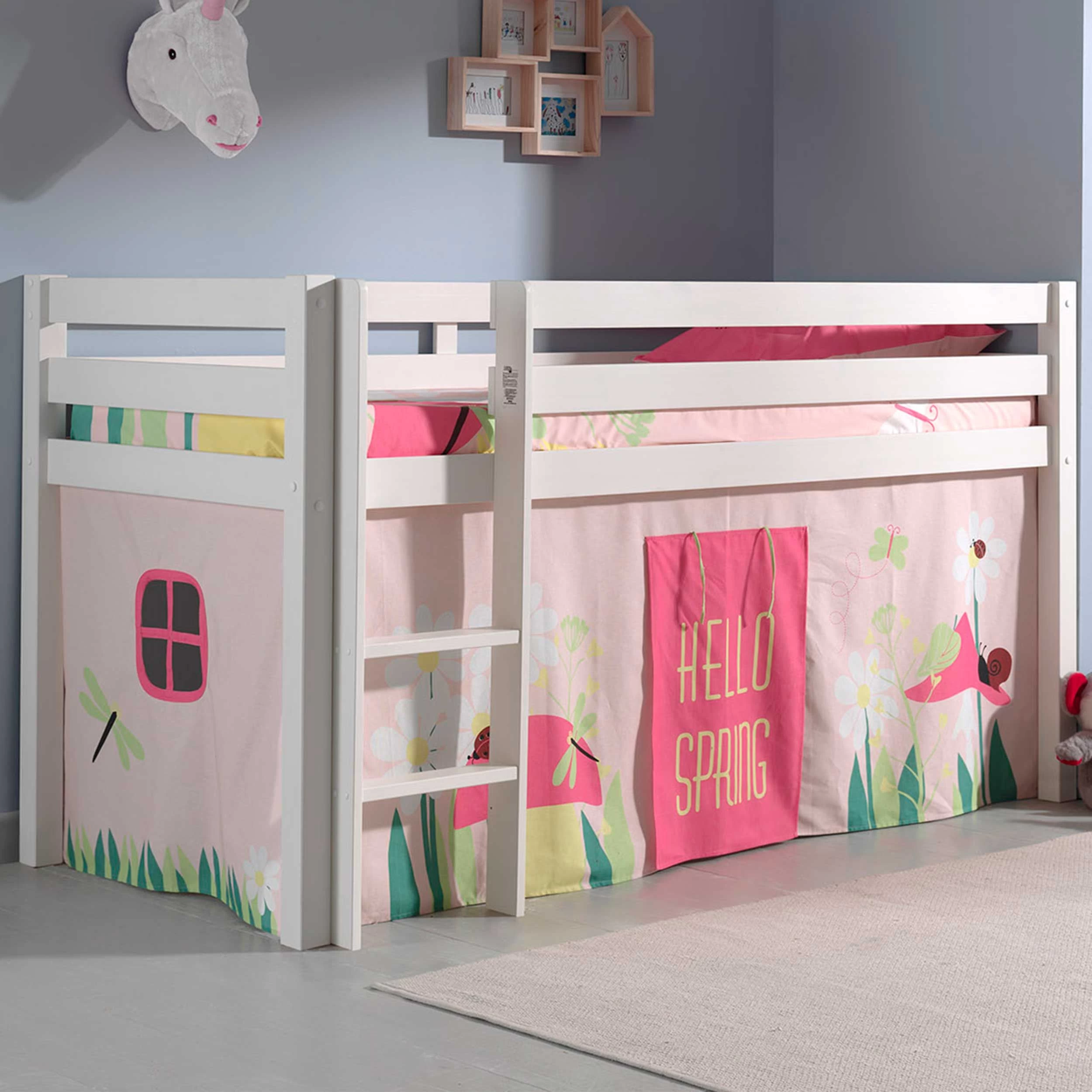 Fabriqué en pin massif laqué blanc, ce lit mi-hauteur Charlotte est équipé d’une tente de lit sous le thème de printemps. Les pieds de lit ont une épaisseur de 6,5 x 6,5 cm, garantissant la stabilité du lit. Le lit mi-hauteur Astrid s’adapte à un matelas de 90×200 cm. Nous vous conseillons d’opter pour notre matelas Confort. Le sommier à lattes est compris.