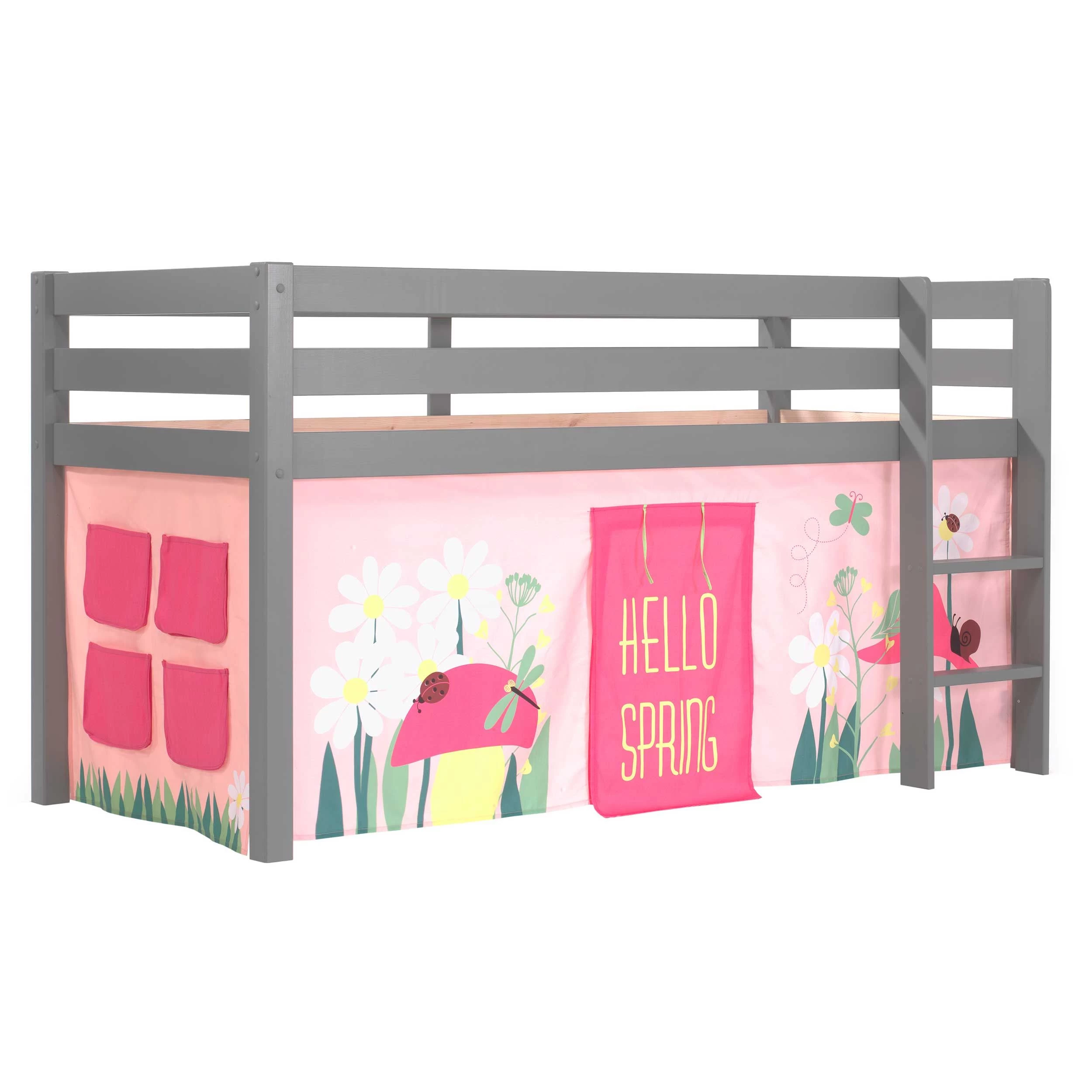 Fabriqué en pin massif laqué en gris, ce lit mi-hauteur Charlotte est équipé d’une tente de lit sous le thème de printemps. Les pieds de lit ont une épaisseur de 6,5 x 6,5 cm, garantissant la stabilité du lit. Le lit mi-hauteur Astrid s’adapte à un matelas de 90×200 cm. Nous vous conseillons d’opter pour notre matelas Confort. Le sommier à lattes est compris.