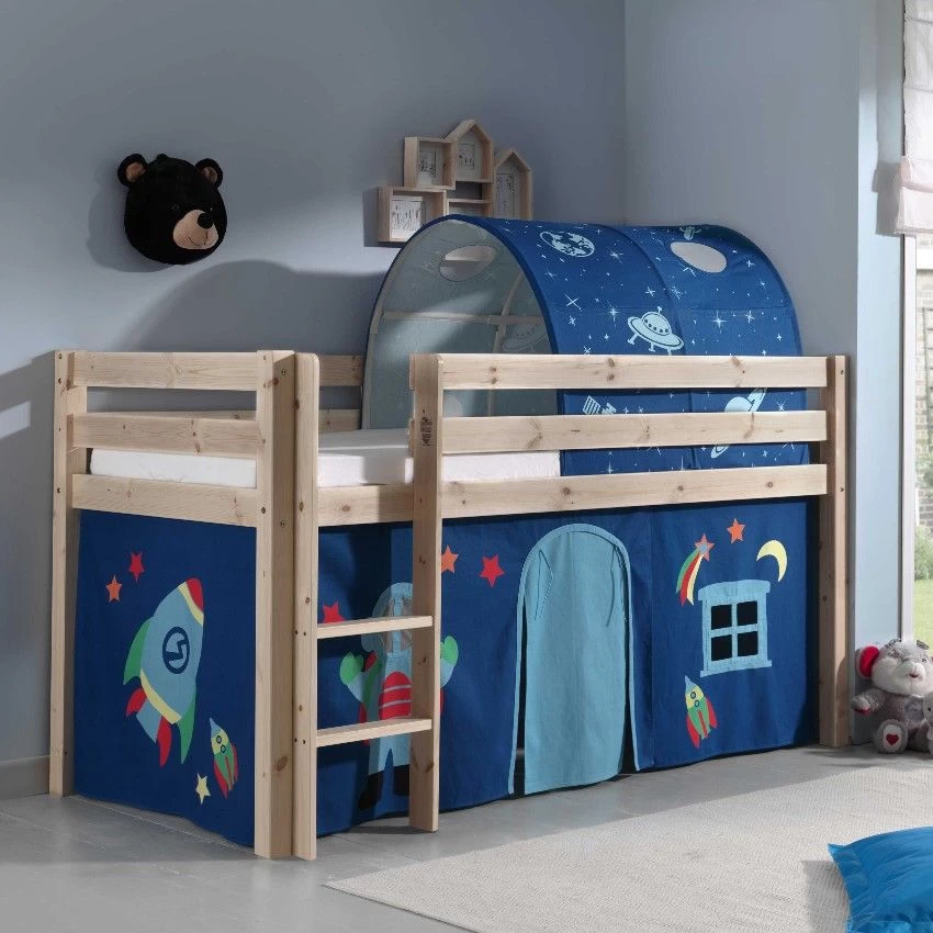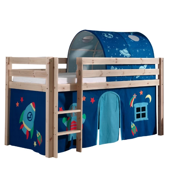Cet ensemble comprend le lit mi-hauteur Charlotte avec la tente de lit et le tunnel de lit Astro. Le lit mi-hauteur Charlotte est fabriquée en bois de pin laqué et convient à un matelas de 90 cm sur 200 cm. Ce lit mi-hauteur stable a des pieds de 6,5 x 6,5 cm. Le lit est adapté aux enfants à partir de 6 ans et dispose d’une échelle droite avec de larges marches. Un kit de sécurité supplémentaire (2 poignées + bandes antidérapantes) pour l’échelle et une étagère peuvent être achetés en option.
