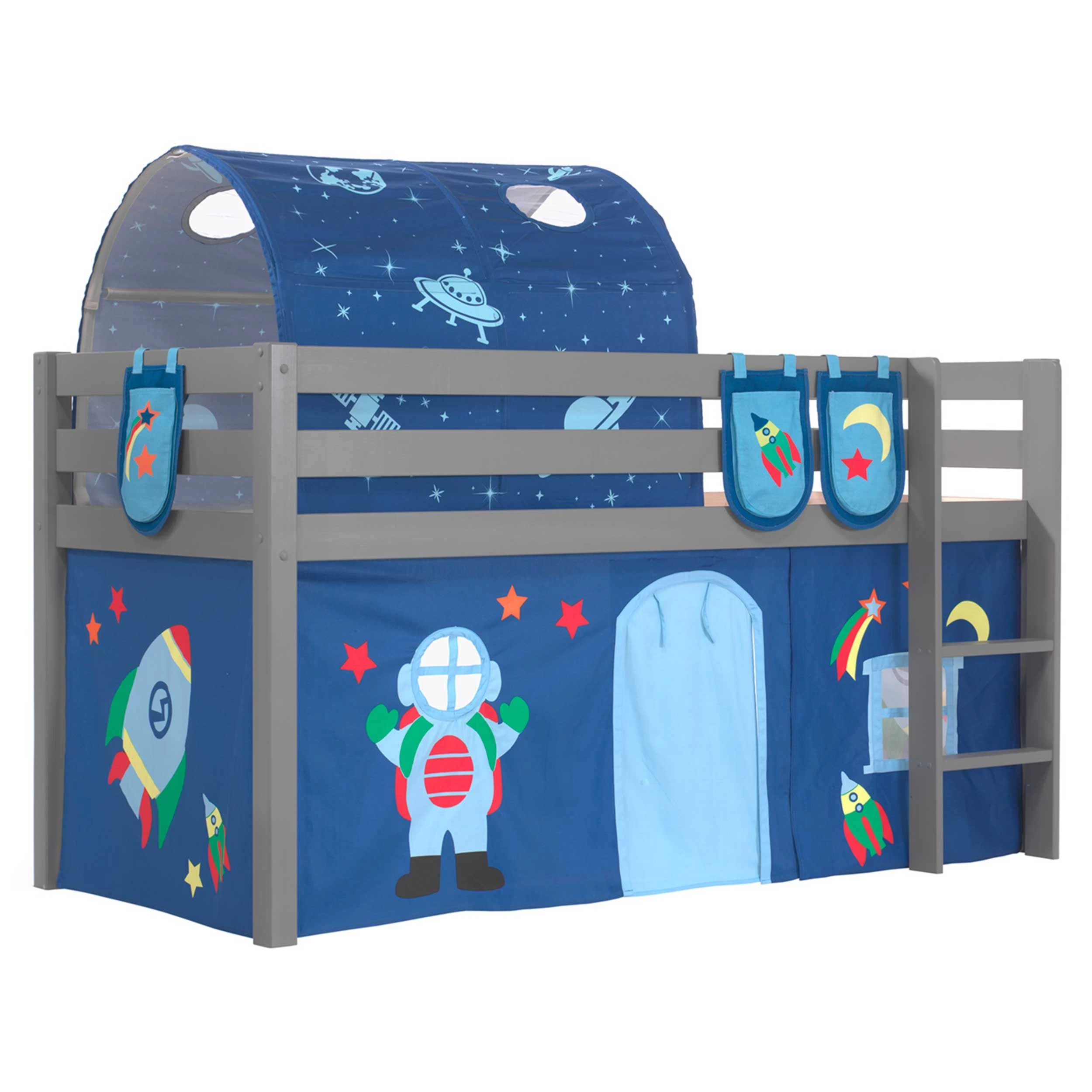 Cet ensemble comprend le lit mi-hauteur Charlotte et la tente de lit, le tunnel de lit et les sacs de rangement Astro. Le lit mi-hauteur Charlotte est fabriquée en bois de pin laqué et convient à un matelas de 90 cm sur 200 cm. Ce lit mi-hauteur stable a des pieds de 6,5 x 6,5 cm. Le lit est adapté aux enfants à partir de 6 ans et dispose d’une échelle droite avec de larges marches. Les accessoires de lit Astro sont imprimés d’un astronaute et d’une fusée et sont fabriqués en coton de couleur bleue. En bref, cet ensemble est un véritable must pour les petits astronautes.