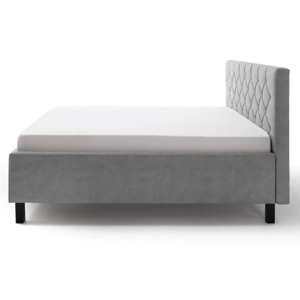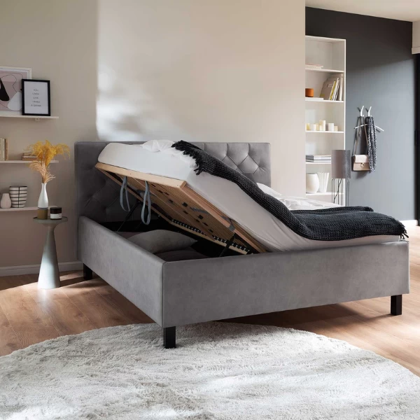 Grâce à la tête de lit capitonnée, les lits San Marino ajoutent une touche de classe à votre chambre à coucher. Ce lit aux pieds en bois noirs est recouvert d’un revêtement en similicuir de couleur grise. L’espace de rangement sous le sommier à lattes est une caractéristique pratique des lits. Vous disposez ainsi d’un espace supplémentaire pour le linge de lit, par exemple. Ce lit a une surface de couchage de 160x200cm. Le matelas n’est pas inclus. Les lits San Marino sont disponibles en différentes variantes. Découvrez-les sur notre site web.