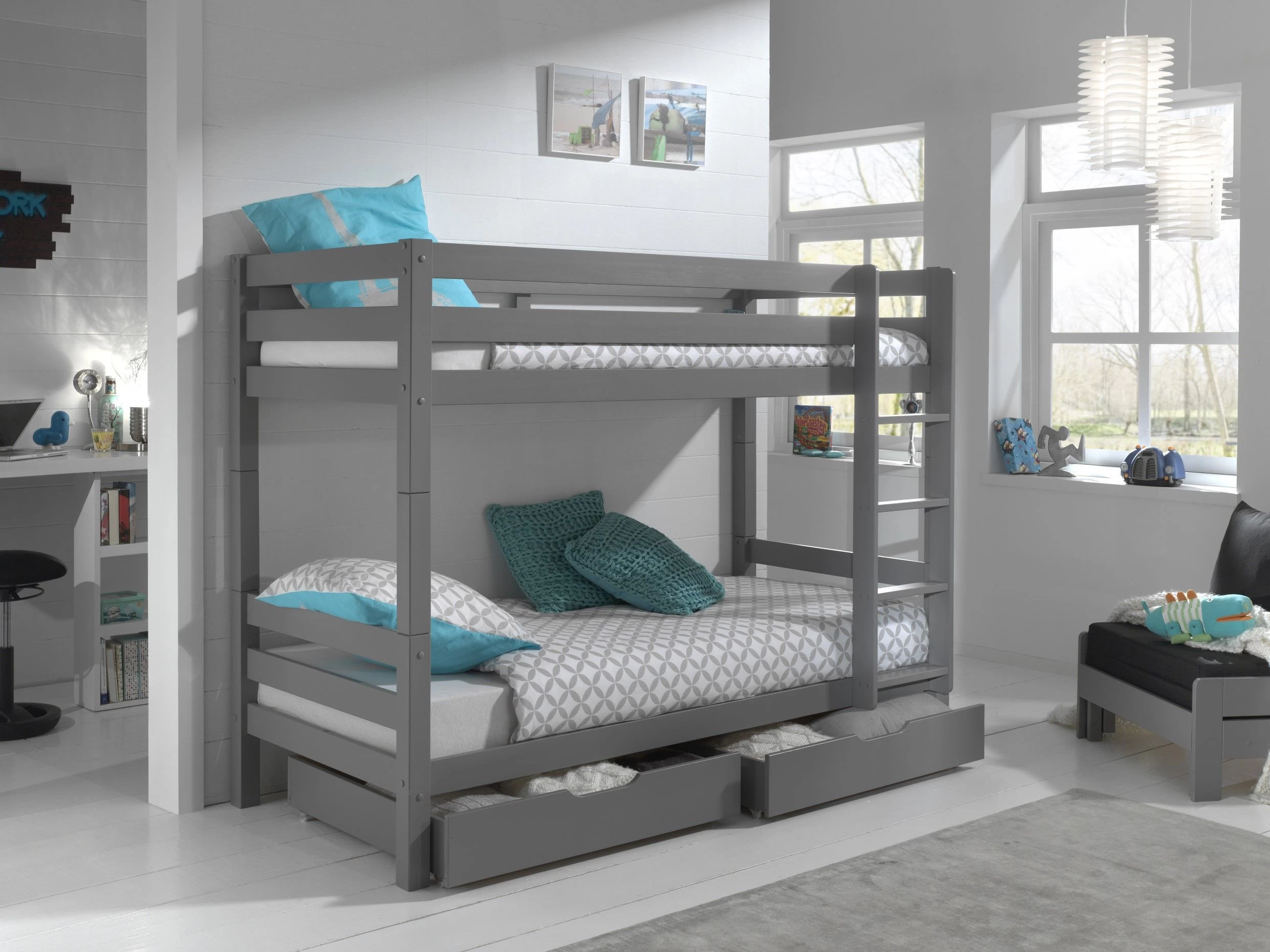 Le lit superposé Claire est équipé d’une échelle qui se laise installer facilement soit à gauche, soit à droit du lit. Il convient aux enfants âgés de 6 ans et plus. Si vous le souhaitez, vous pouvez transformer ce lit en 2 lits simples. Grâce aux deux tiroirs de rangement inclus, vous disposez également d’un espace de rangement supplémentaire pour, par exemple, le linge de lit ou les pyjamas. Le lit superposé Claire est adapté à 2 matelas de 90 x 200 cm avec une hauteur maximale de 20 cm. Nous vous conseillons d’opter pour nos matelas Confort. Les sommiers à lattes sont déjà compris.