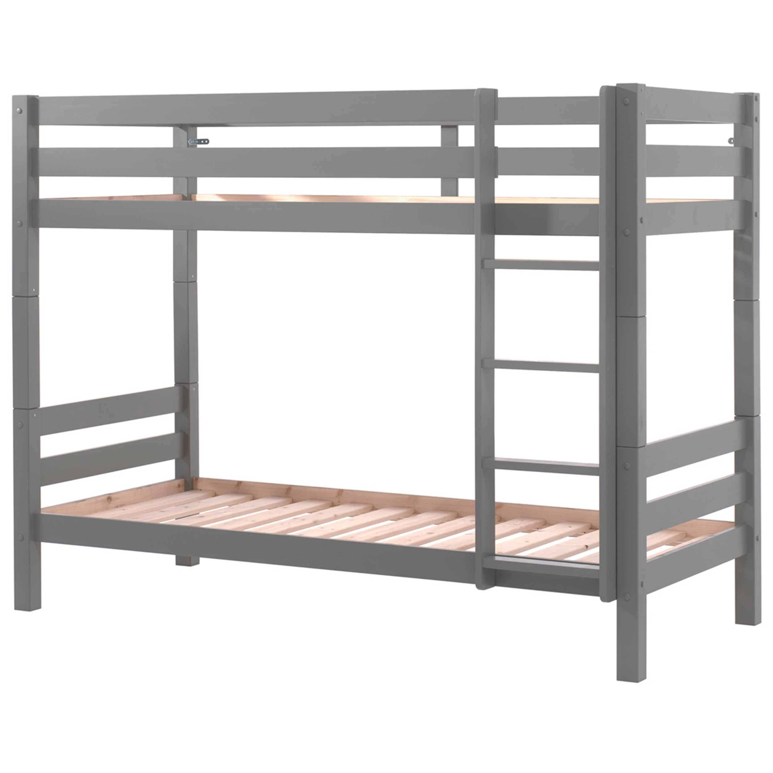 En tant que meuble peu encombrant, le lit superposé Claire de 160 cm de haut présente la solution par excellence pour aménager une chambre pour deux, même sous le toit de votre maison. Réalisé en pin massif laqué gris, le lit est doté de pieds solides de 6,5 x 6,5 cm. Le vernis transparent à base d’eau ne contient pas de substances toxiques.