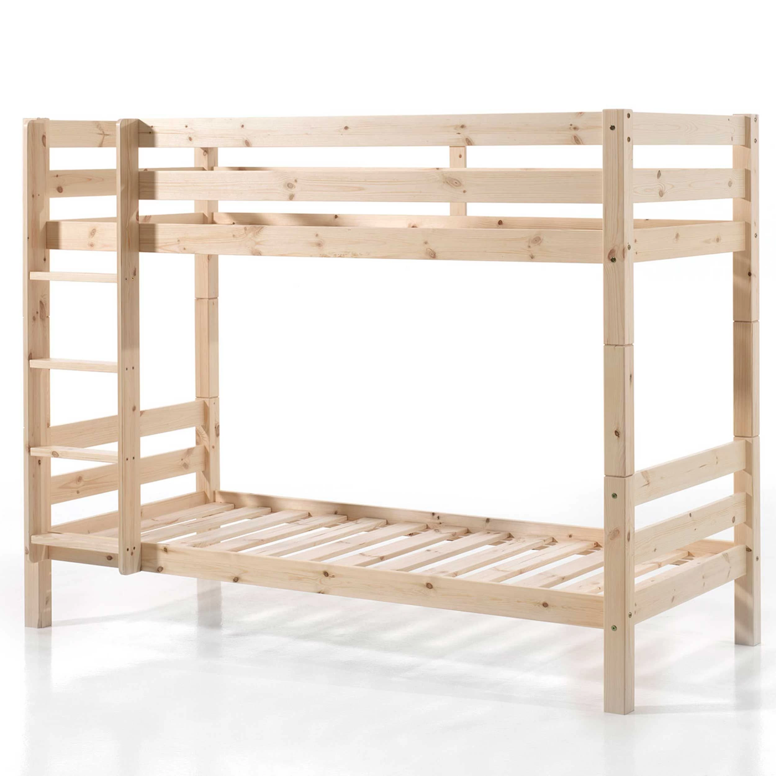 En tant que meuble peu encombrant, le lit superposé Claire de 160 cm de haut présente la solution par excellence pour aménager une chambre pour deux, même sous le toit de votre maison. Réalisé en pin massif laqué blanc, le lit est doté de pieds solides de 6,5 x 6,5 cm. Le vernis transparent à base d’eau ne contient pas de substances toxiques.