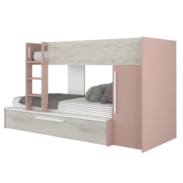 Le lit superposé Fleur vous permet d’exploiter au mieux l’espace de votre chambre d’amis ou de votre chambre d’enfants partagée. Les accents vieux rose du lit superposé donnent à la chambre un aspect adorable. Le lit superposé offre de la place pour 2 matelas de 90×200 cm. Dans un tiroir-lit coulissant, il y a également de la place pour un matelas de 90×190 cm. Ces matelas ne sont pas inclus et peuvent être achetés sur notre site web. Le lit comporte une armoire avec tringle à vêtements et étagère. Le lit superposé Fleur est fabriqué en panneaux de particules et a été fini en mélamine de haute qualité. Pour éviter les accidents, l’échelle est dotée de poignées incurvées et de bandes antidérapantes. Ce lit est également disponible dans d’autres couleurs. Découvrez-les tous sur notre site web.