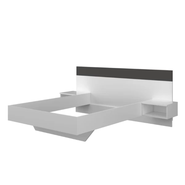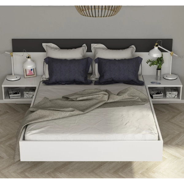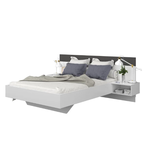 Le lit Noa se caractérise par des lignes épurées et un design minimaliste. Les deux couleurs qui prédominent dans ce lit sont le blanc brillant et le gris graphite. C’est pratique, car cela permet d’utiliser le lit dans n’importe quelle pièce à la décoration moderne. Le pied au milieu donne également l’impression que le lit flotte. Un petit détail, mais qui permet à ce lit de se distinguer des autres lits. Chaque côté du lit dispose d’une table de chevet. Ce lit convient à un matelas de 140 par 190 cm. Ce matelas n’est pas inclus. Ce lit est fabriqué en panneaux de particules et est fini avec de la mélamine de haute qualité. Dimensions de la table de chevet : 47x39x22.80 cmDimensions totales : 197x241x95.50 cm