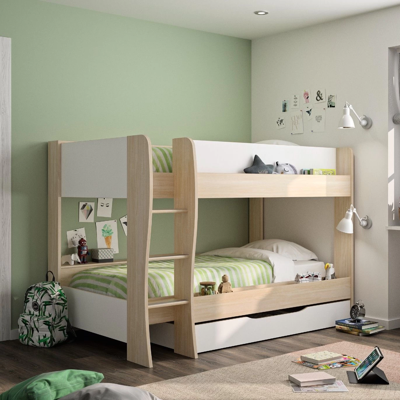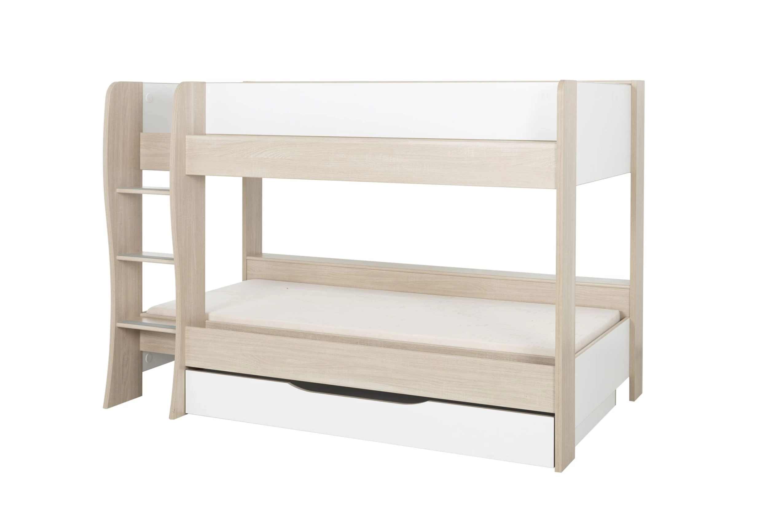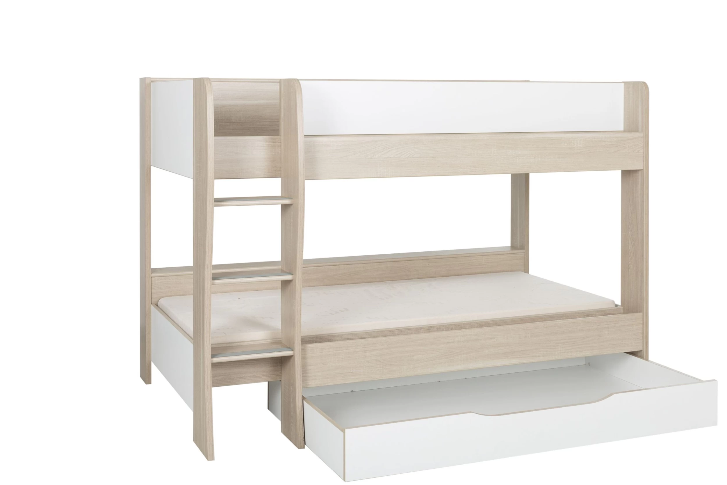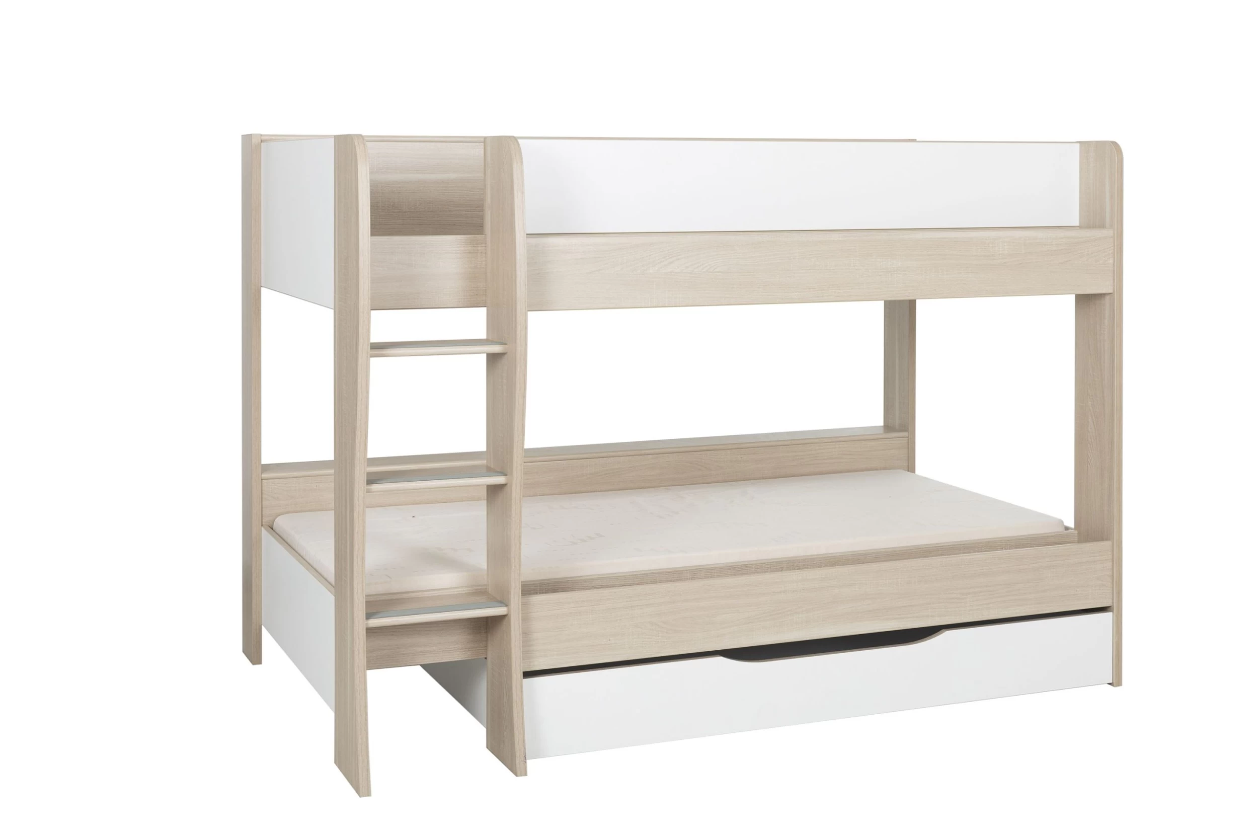 Ces lits superposés Maiko ont un décor en chêne clair avec des accents blanc neutre et s’intègrent avec aisance dans une chambre d’enfant colorée. Chaque lit est pourvu d’une tablette de dépose (épaisseur 15,5 cm) et d’un bac de rangement (largeur 13 cm et profondeur 14 cm) pour les affaires de vos 2 trésors.