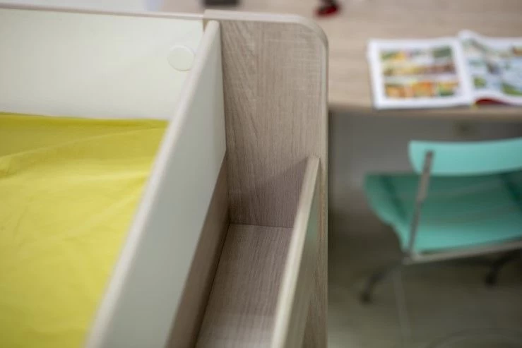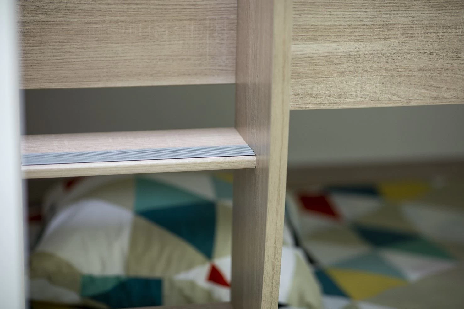 Le lit supérieur convient pour des enfants à partir de 6 ans. Les marches pour monter sont épaises de 25 mm et sont dotées d’une bande antidérapante.
