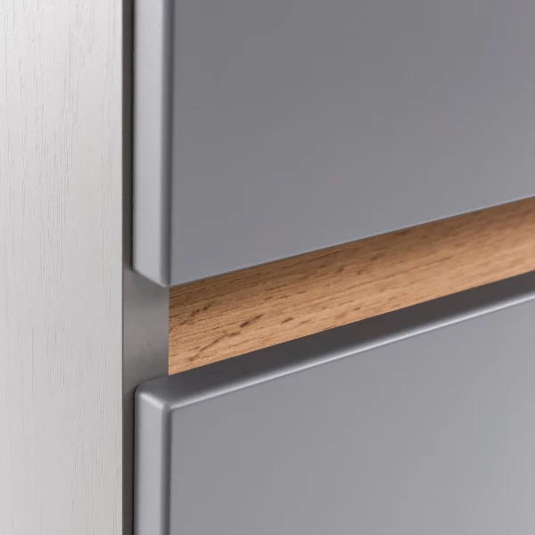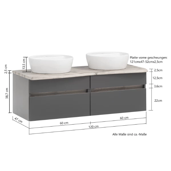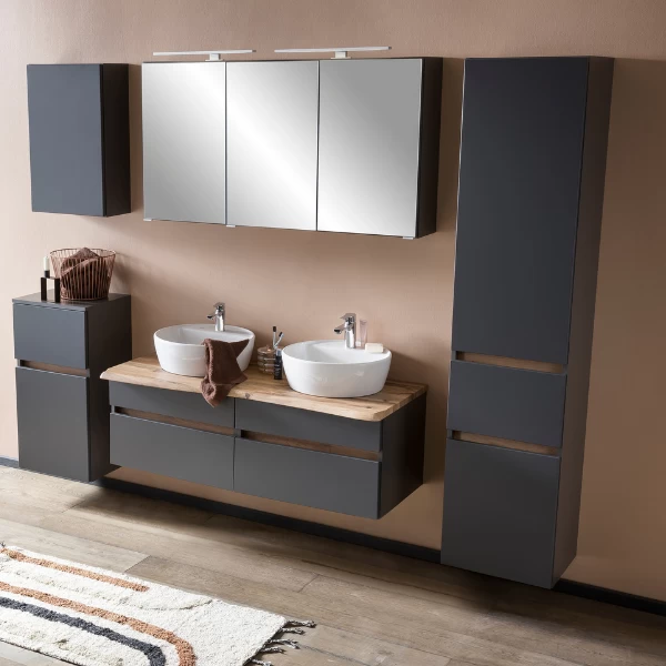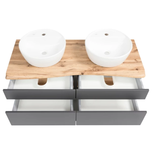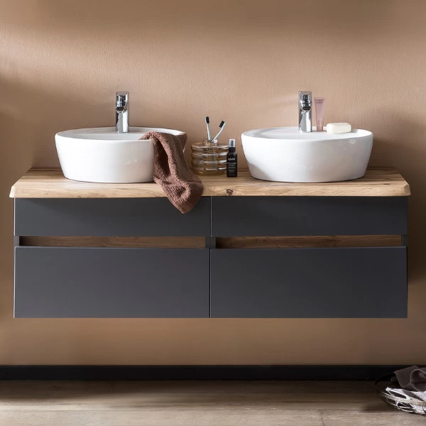 La collection Vikas combine un design minimaliste avec un look naturel. Ce meuble-lavabo est fabriqué en panneaux d’aggloméré et de MDF, avec une finition en mélamine dans un décor anthracite et chêne. Le design épuré et l’aspect bois créent un look pur, tandis que la forme organique du plateau de table renforce le caractère naturel. Les lavabos en céramique sont inclus. Grâce aux tiroirs de rangement, vous pouvez ranger proprement toutes sortes d’ustensiles de salle de bains. Cette collection est également disponible en finition chêne. Voir la gamme complète sur notre site web.