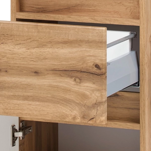 La collection Vikas combine un design minimaliste avec un look naturel. Cette armoire colonne est fabriquée en panneaux de particules et MDF et finie en mélamine dans un décor de chêne. Le design épuré et l’aspect bois créent un look pur. Vous pouvez facilement fixer l’armoire au mur, ou la placer sur le sol grâce aux pieds fournis. L’armoire est dotée d’un tiroir dans lequel vous pouvez ranger soigneusement toutes sortes de petites choses. Derrière les deux portes, il y a quatre étagères au total, ce qui vous donne beaucoup d’espace de rangement pour les serviettes de bain, par exemple. Cette collection est également disponible en finition anthracite. Consultez la gamme complète sur notre site web.