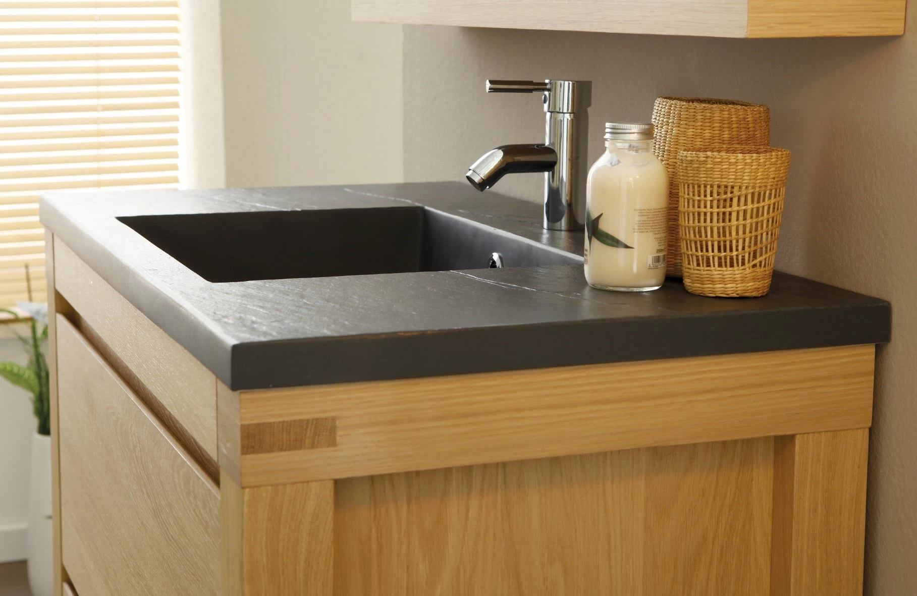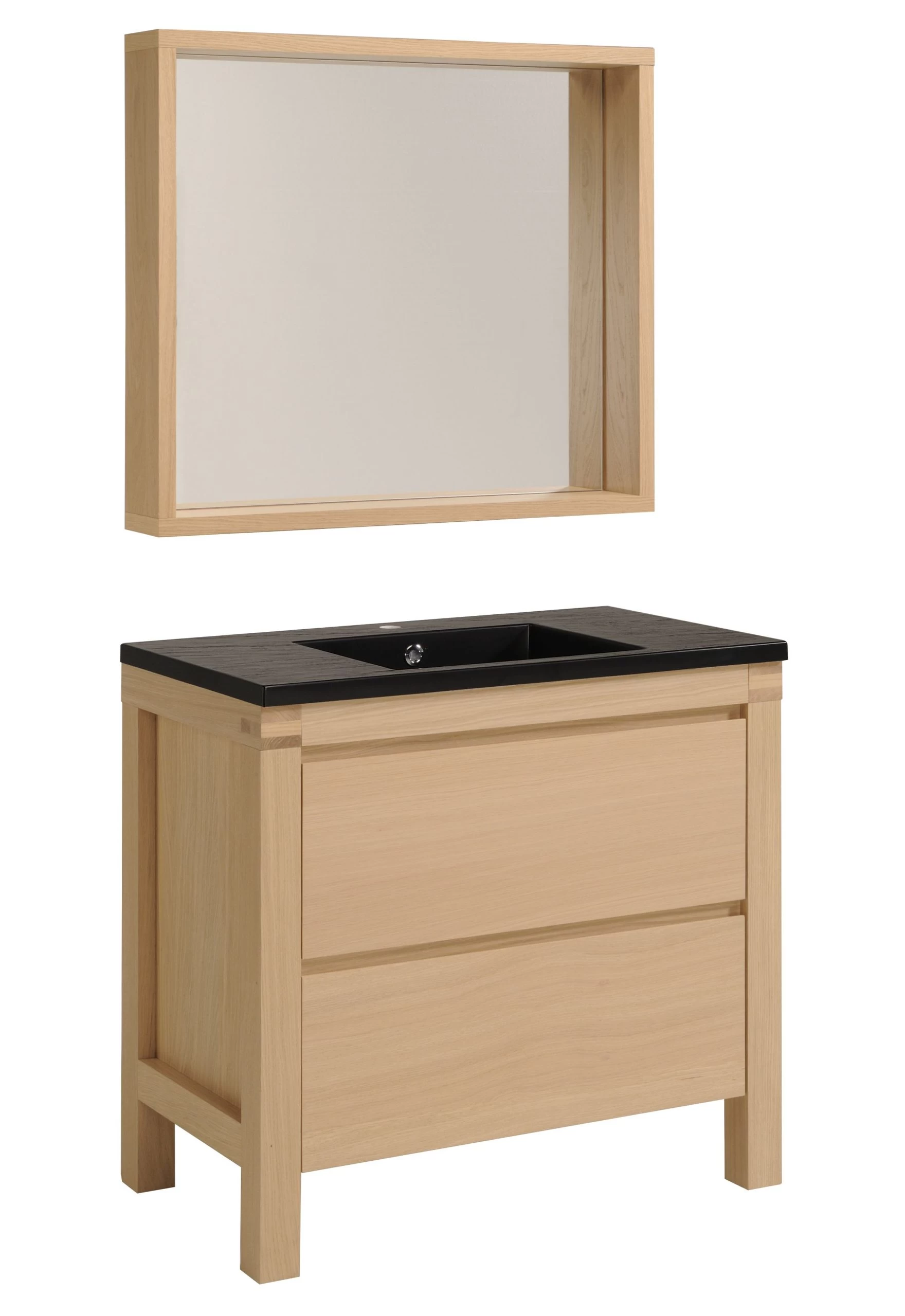 Ce meuble lavabo est équipé de 2 tiroirs avec prise de main et système « softclose » intégrés. Les tiroirs compartimentés vous offrent un rangement organisé. Le plan est doté d’une finition ardoise, apportant au meuble un design moderne et quand même naturel en combinaison avec le bois.
