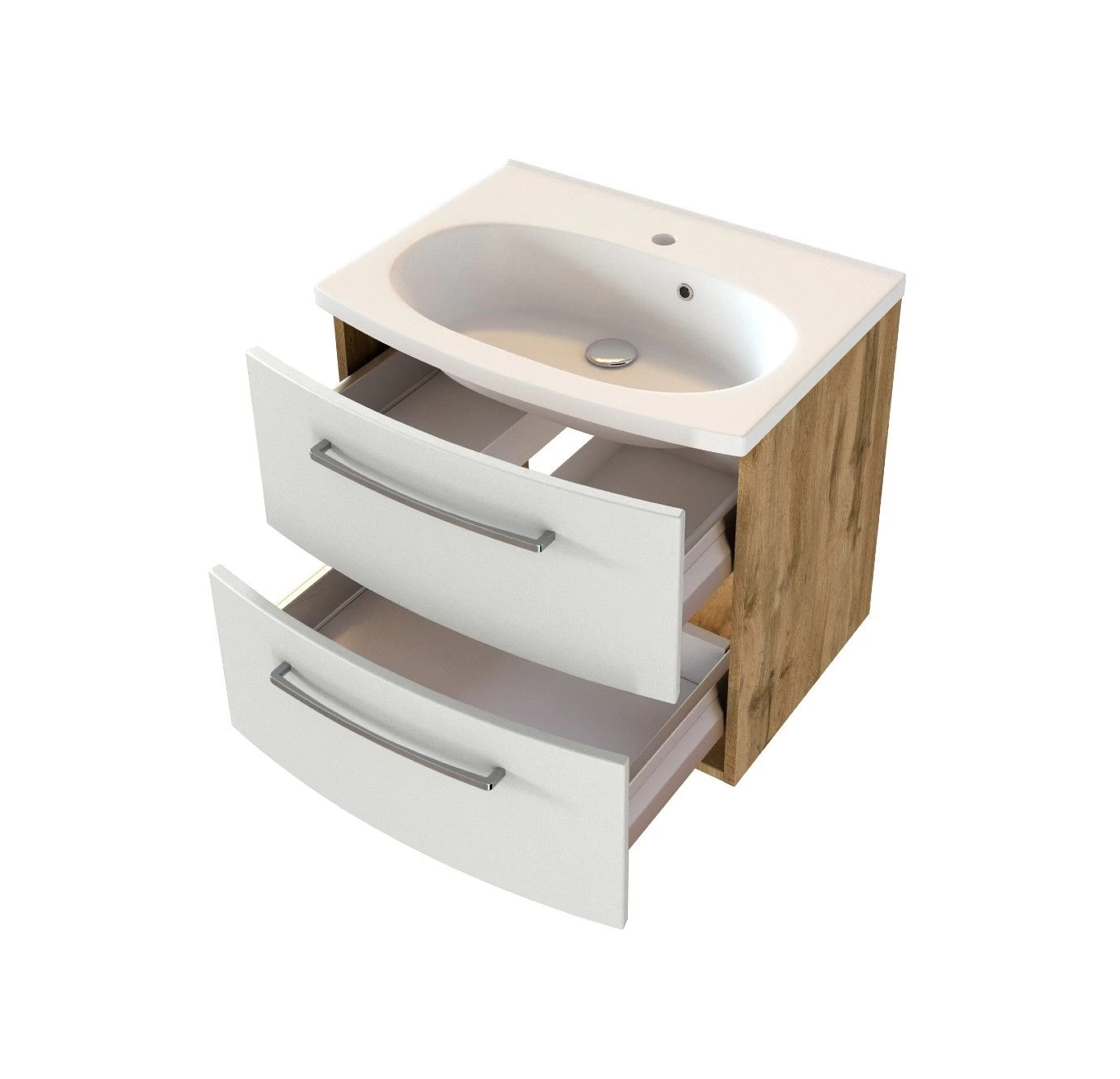 Les meubles de la série Gene vous permettent de transformer votre salle de bains de manière élégante. Le lavabo de 60 cm de large est équipé de deux tiroirs à fermeture douce, réalisés en MDF gris clair mat. Le reste du meuble est constitué de panneaux de particules en décor chêne wotan, recouverts d’une couche de mélamine. Le lavabo est inclus. Découvrez les possibilités étendues de la collection Gene sur notre site web !