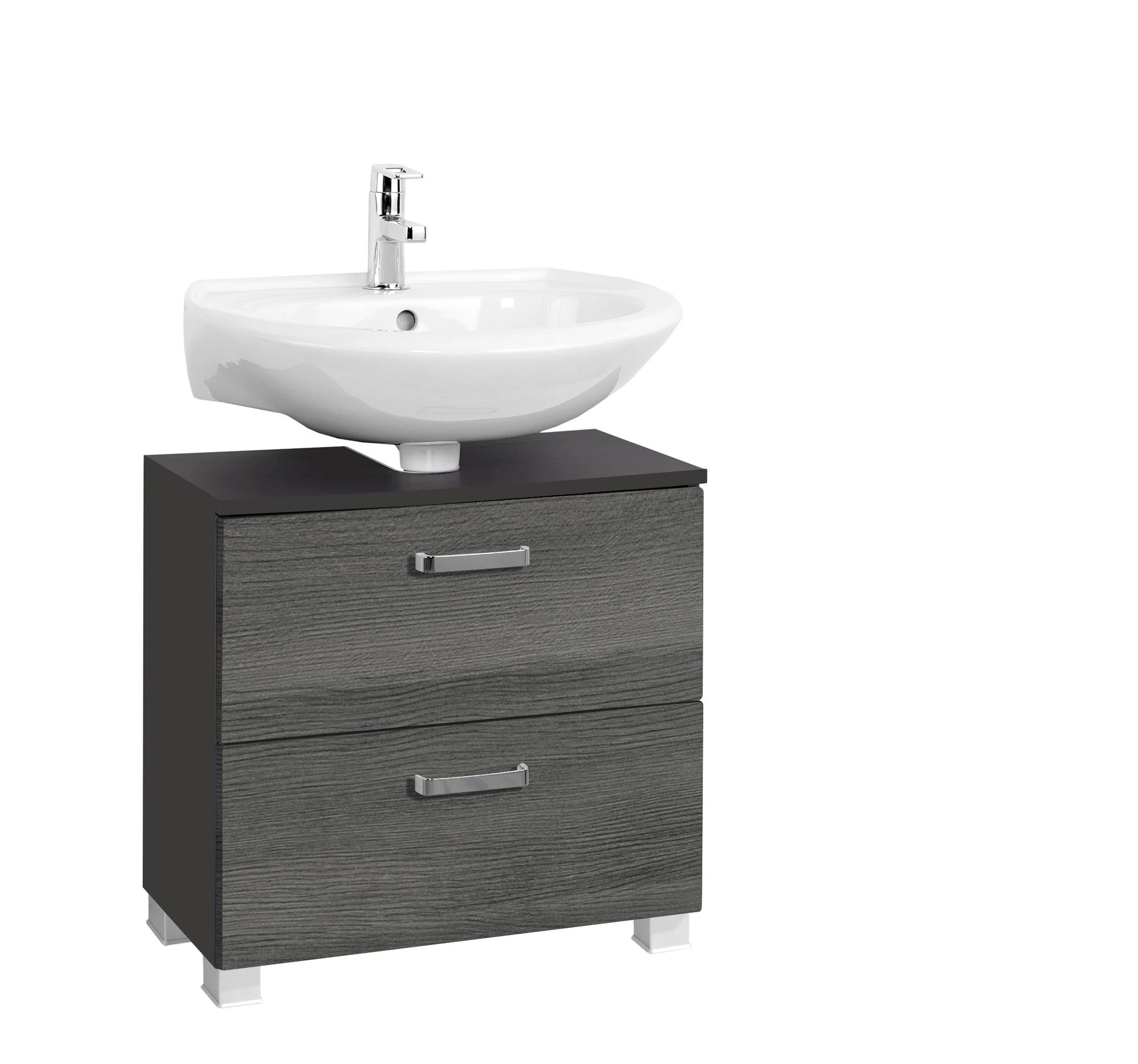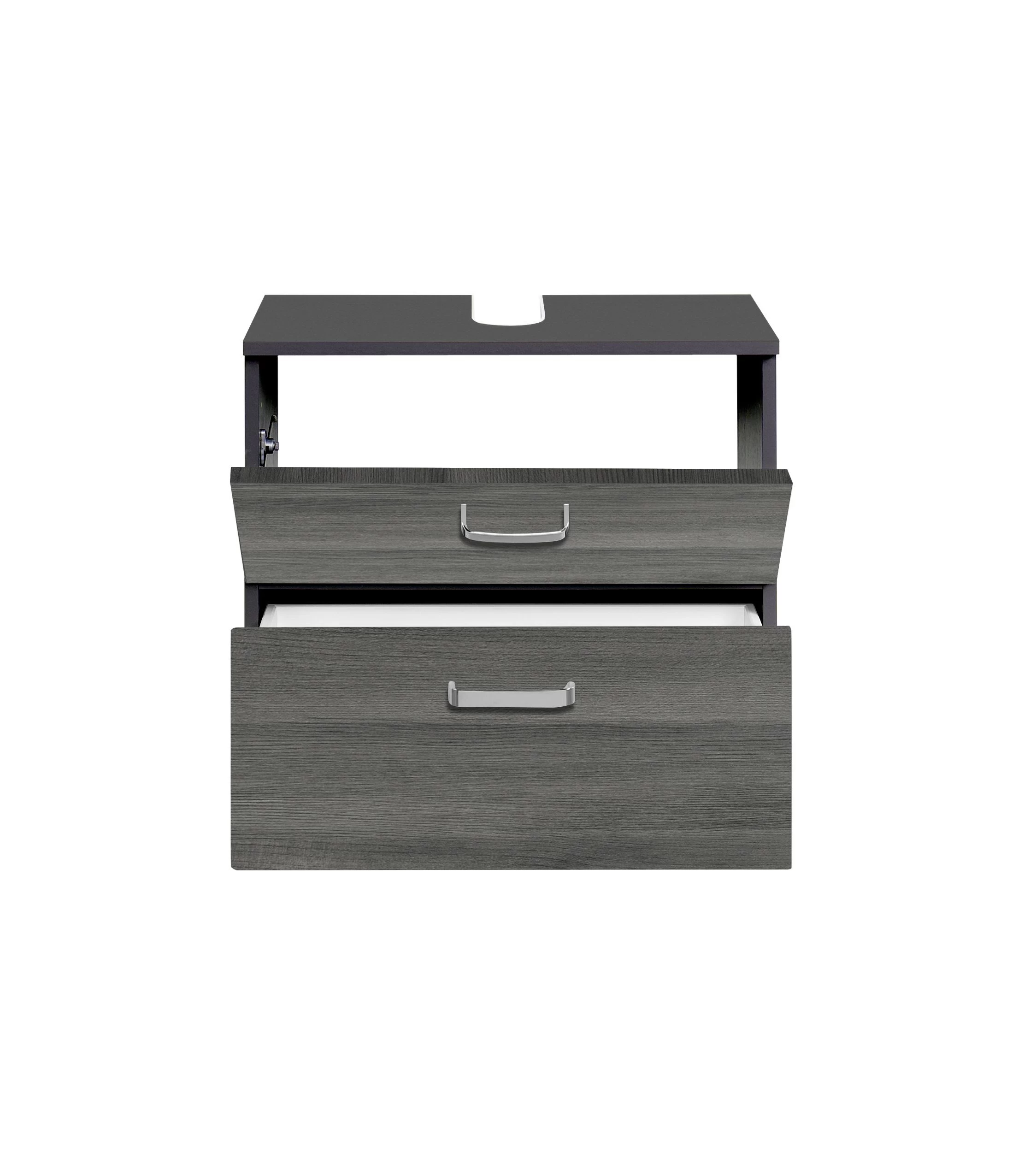 Le meuble sous lavabo Bobbi est réalisé en panneaux de particules mélaminés. Les fronts du tiroir et de la porte sont réalisés en MDF mélaminé avec un décor en chêne gris.