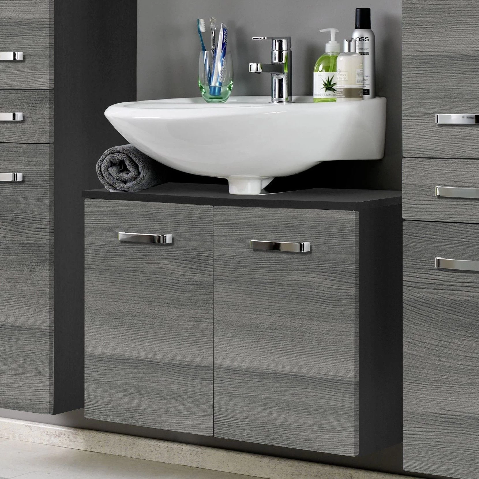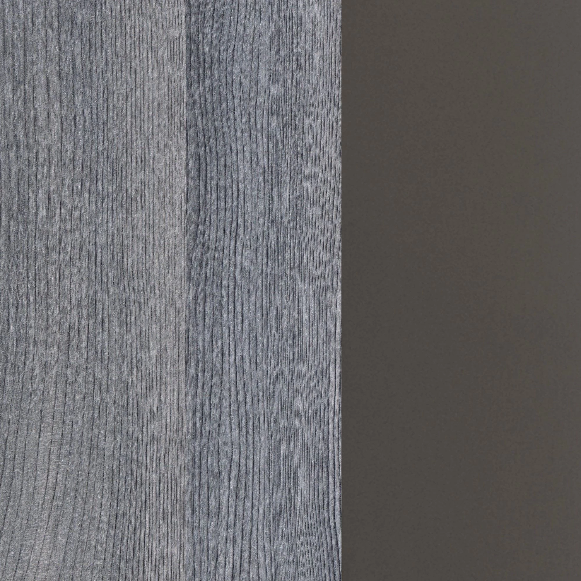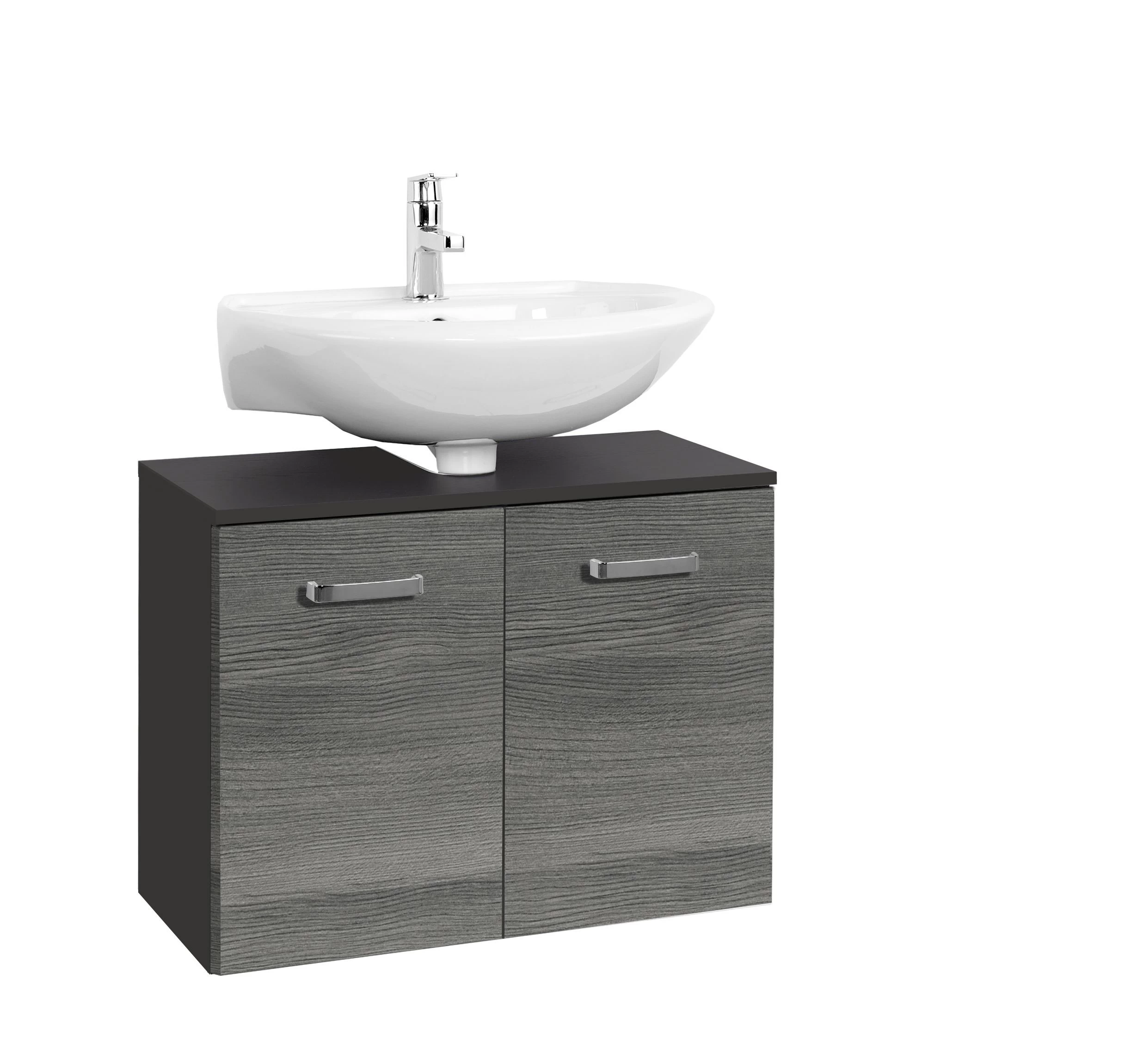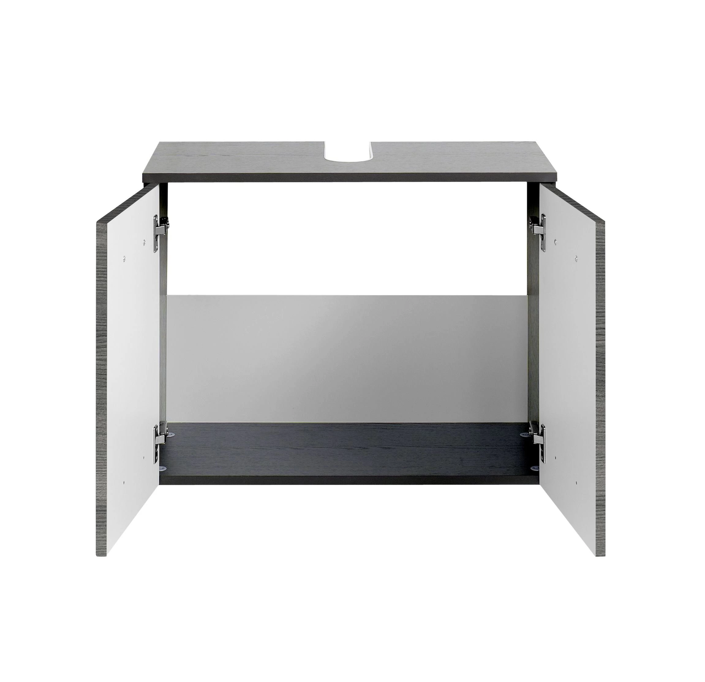 Le meuble sous lavabo Bobbi est réalisé en panneaux de particules mélaminés. Les fronts des portes sont réalisés en MDF mélaminé avec un décor en chêne gris.