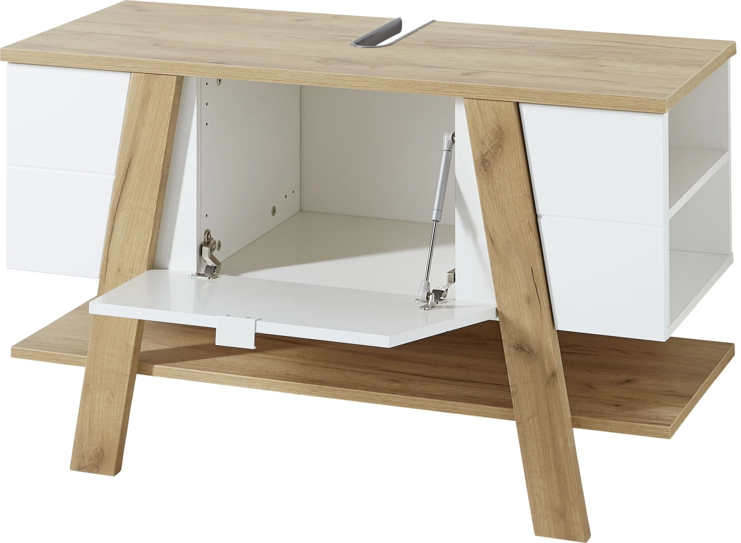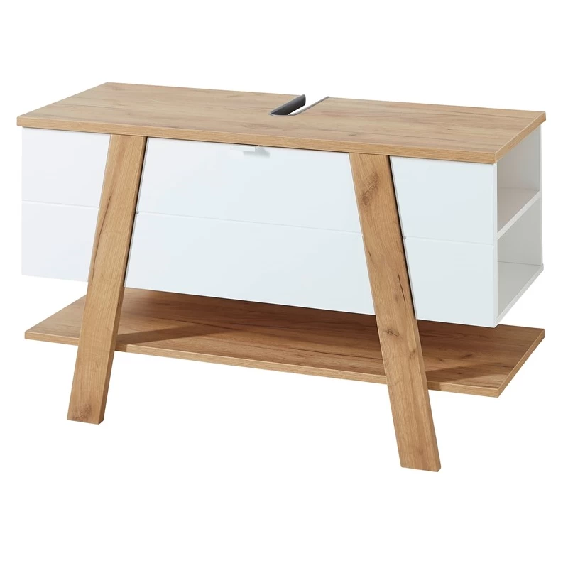 Ce meuble-lavabo Nove Mila envoie une vague de détente dans votre salle de bains. Le design blanc intemporel aux accents de chêne, associé à l’aspect moderne du meuble, crée une ambiance douce et scandinave dans votre salle de bains. L’asymétrie frappante de l’armoire fait une déclaration dans votre salle de bains. Les deux étagères et le rabat avec rembourrage intégré offrent beaucoup d’espace pour vos ustensiles de salle de bains. Les étagères situées au-dessus et au-dessous du battant créent un espace de rangement supplémentaire pour les serviettes, les cosmétiques, les articles de toilette et autres accessoires. Les meubles sont principalement fabriqués en panneaux de particules et finis avec une couche de mélamine.