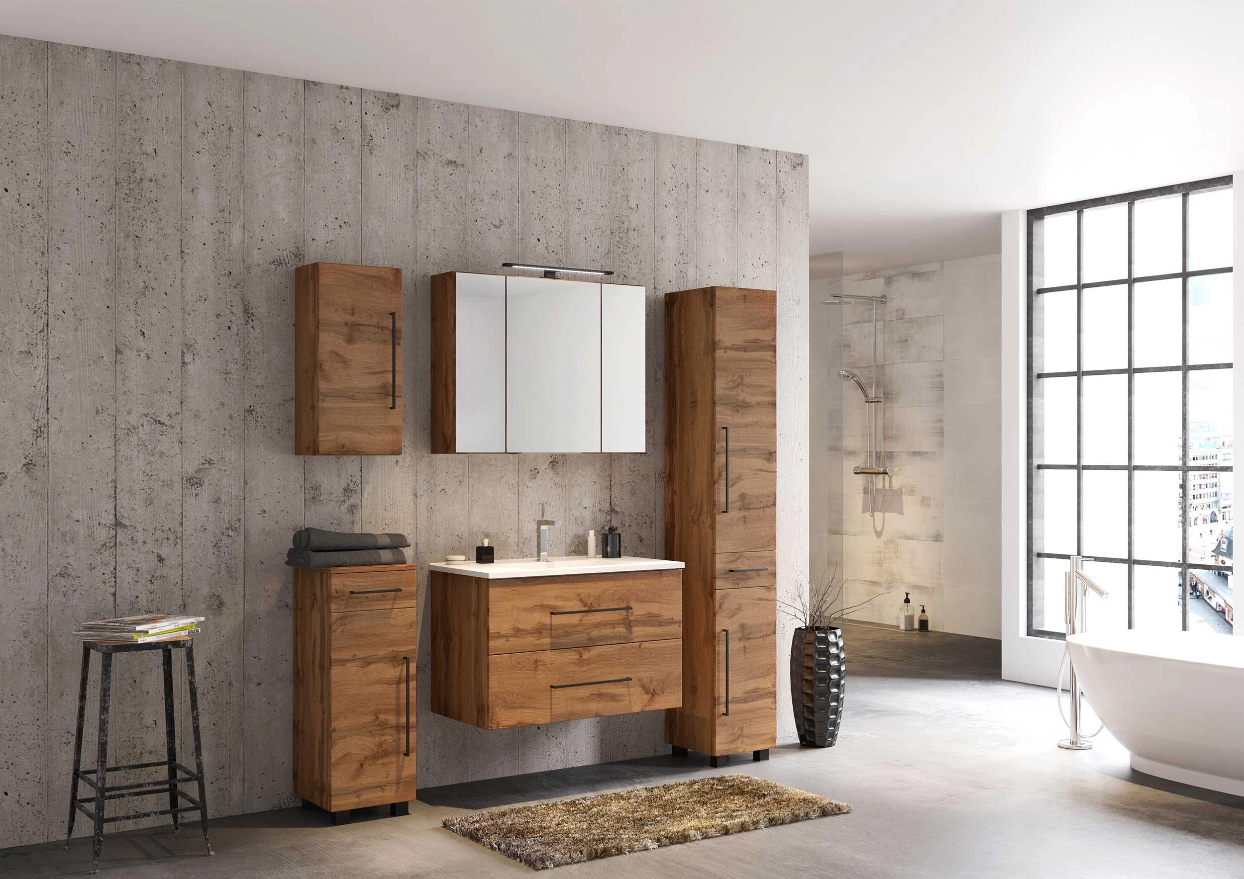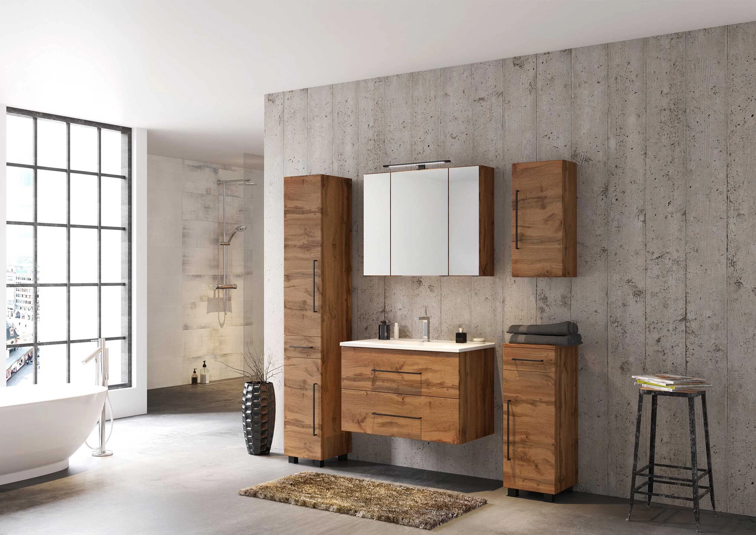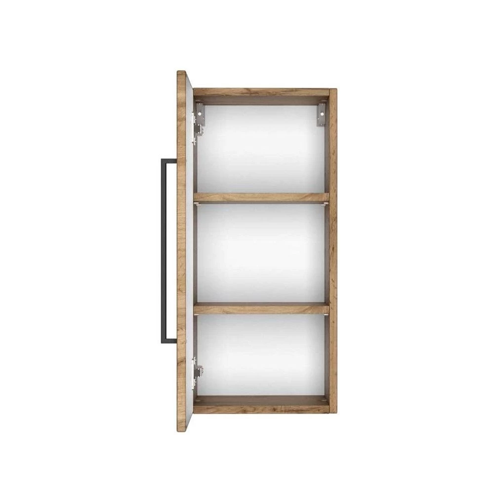 Grâce aux meubles de la collection Dusan, la salle de bains de vos rêves est toute proche. Les meubles en décor chêne wotan sont finis avec des accents noirs, comme les poignées de ce meuble suspendu. L’armoire dispose d’une porte tournante et est fabriquée en panneau de particules mélaminé. La façade est réalisée en MDF mat. Il contient deux étagères.