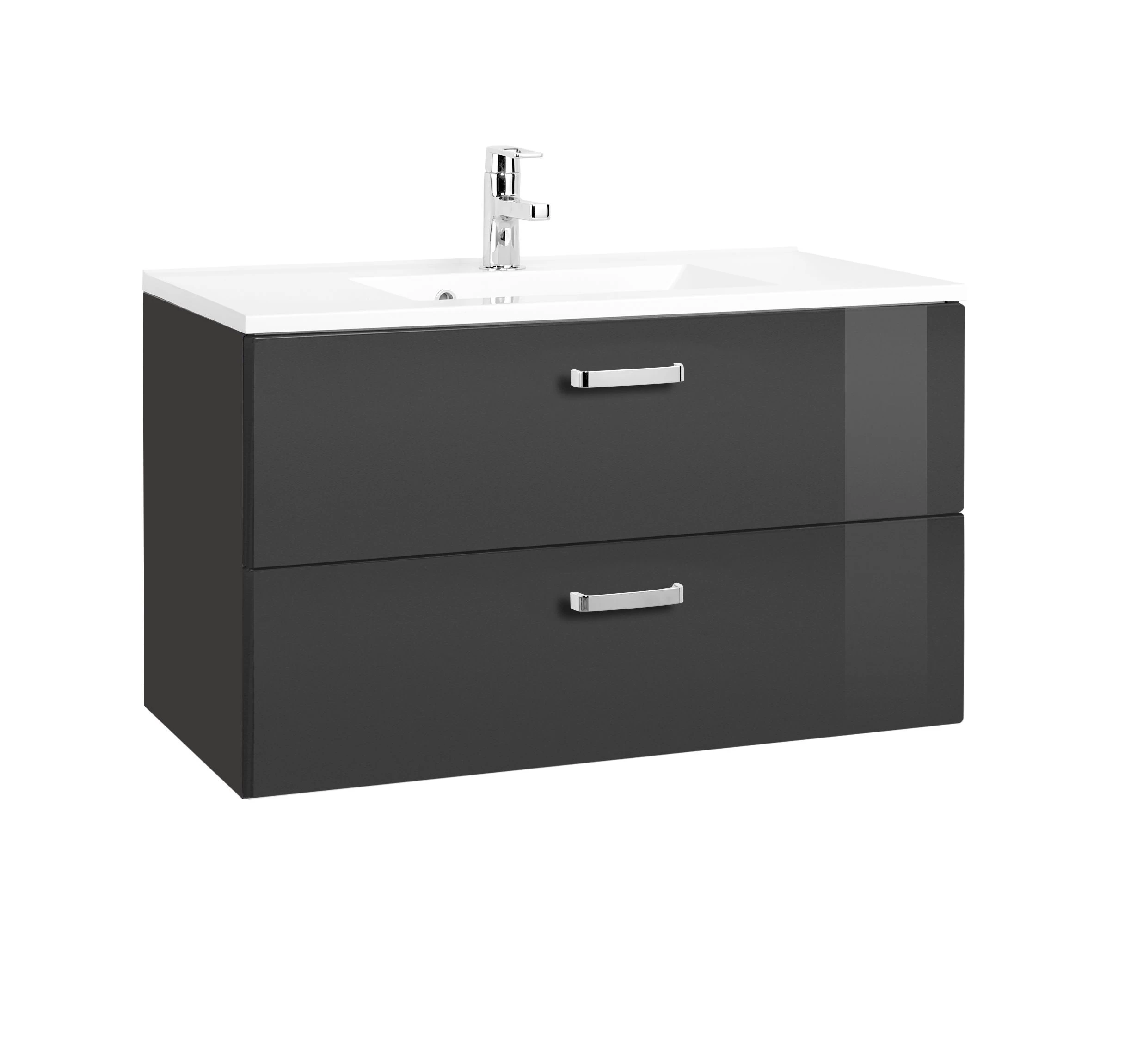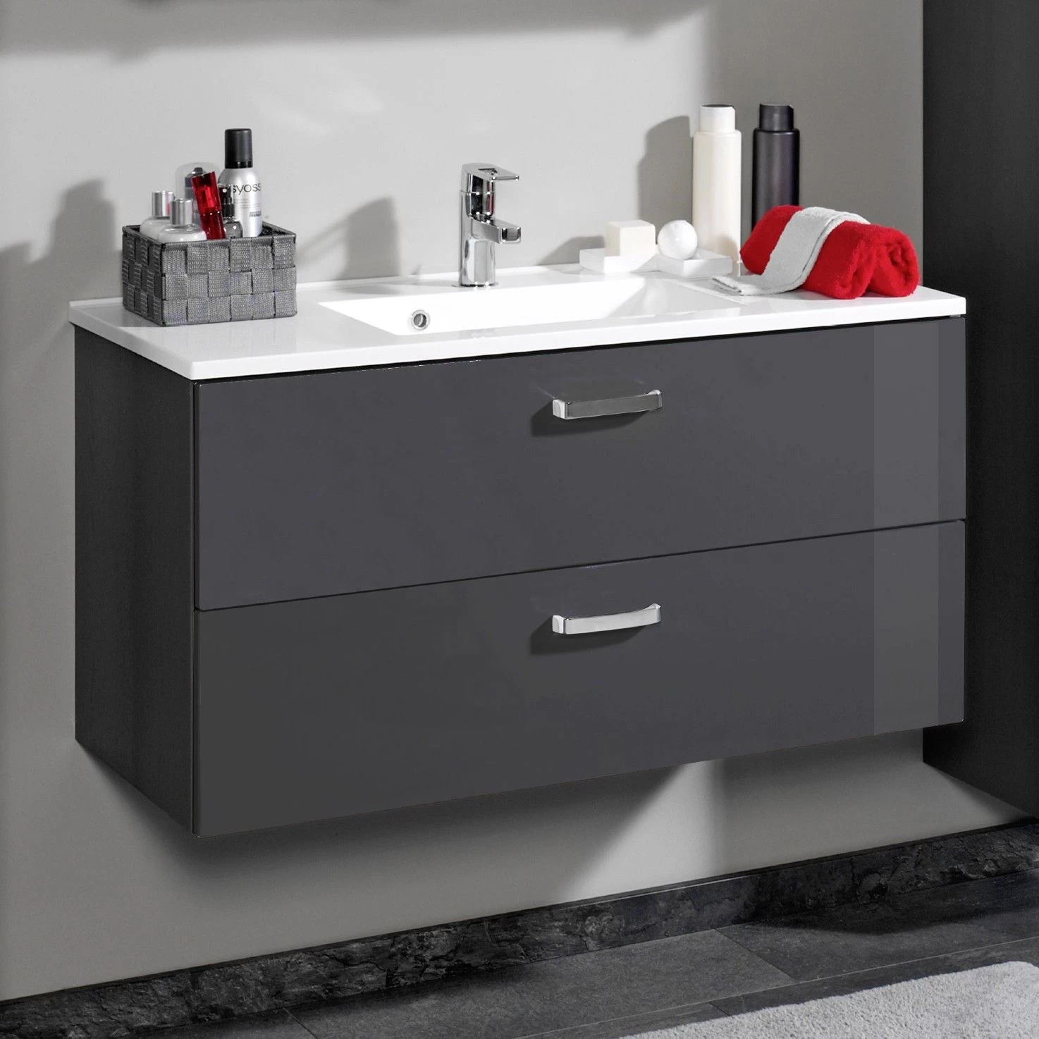 Apportez une touche de fraîcheur à votre salle de bains avec les meubles de la collection Bobbi, qui comprend également ce meuble vasque de 90 cm de large. Il est équipé d’une vasque blanche et de 2 tiroirs à fermeture douce qui sont dotés d’une finition en gris brillant.