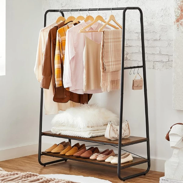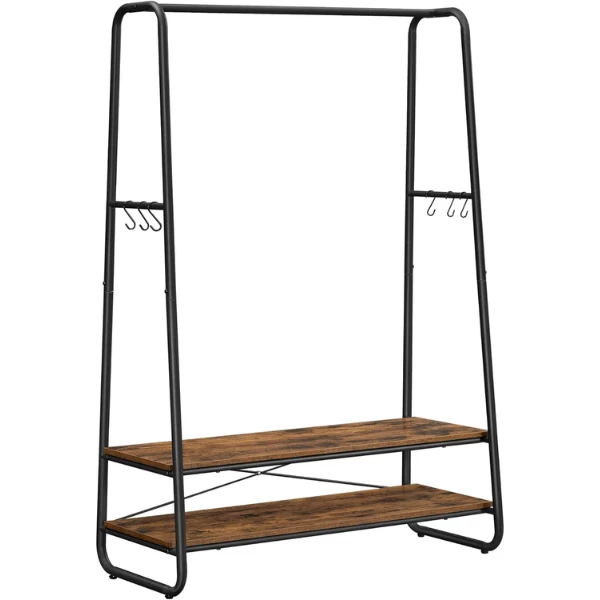CARACTÉRISTIQUES PRINCIPALES:Cette tringle à vêtements robuste avec 2 étagères, 6 crochets en S et un cadre en acier est parfaite pour les chambres à coucher, les entrées ou les espaces industriels. Le cadre de la tringle à vêtements est en acier robuste et résistant, tandis que les deux étagères de rangement sont fabriquées à partir de panneaux de particules durables, suffisamment solides pour supporter jusqu’à 200 kg. Le rail de suspension est conçu pour supporter jusqu’à 30 kg d’articles suspendus tels que vestes, chemises, pantalons, etc. Les 6 crochets en S ont une capacité de charge statique maximale de 5 kg chacun et une capacité totale de 30 kg, ce qui vous permet de suspendre vos accessoires et vos petits articles.Cette tringle à vêtements est facile à assembler et est livrée avec des pièces numérotées et un ensemble d’instructions, ce qui vous permet de la construire facilement. La palette de couleurs rustiques marron et noir donne à votre espace une touche industrielle.AVANTAGES CLÉS:Cette tringle à vêtements n’est pas seulement parfaite pour ajouter un espace de rangement supplémentaire à votre maison, elle vous donne également la liberté d’exposer vos vêtements à la vue de tous. Le cadre en acier robuste et les étagères en panneaux de particules sont suffisamment solides pour accueillir un grand nombre de vêtements. Les 6 crochets en S permettent de suspendre facilement vos accessoires et la palette de couleurs brunes et noires rustiques apporte une touche industrielle à votre espace. De plus, il est facile à assembler grâce à des instructions faciles à suivre et à des pièces numérotées. Avec une capacité de charge statique totale maximale de 200 kg, c’est l’assistant de rangement idéal pour tous vos vêtements et accessoires.