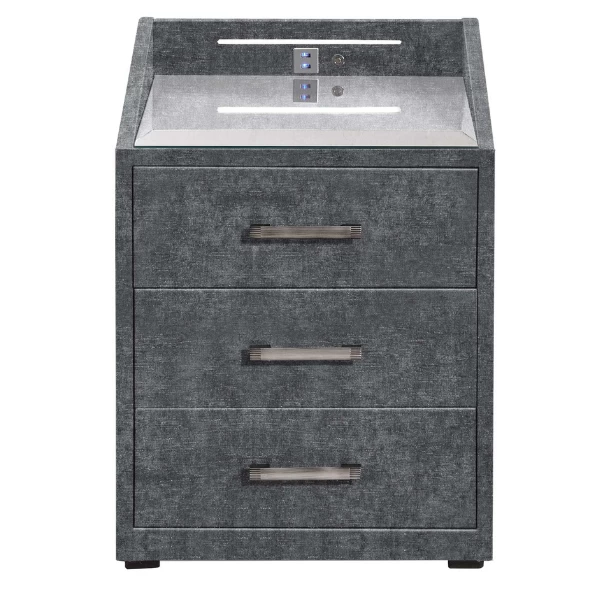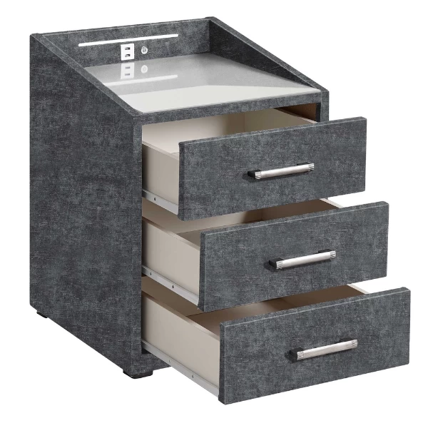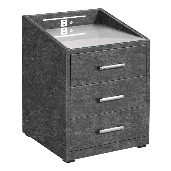 Les tables de chevet Albion sont à la fois pratiques et élégantes. Cette table de chevet est fabriquée en aggloméré et recouverte de polyester couleur anthracite. Grâce aux trois tiroirs, vous pouvez ranger proprement toutes sortes de choses. La table de nuit est équipée d’un éclairage LED et de deux ports USB. Ainsi, votre tablette ou votre smartphone ne sera jamais à court d’énergie. Le plateau en verre et le bord élevé garantissent que tout est stable sur la table de nuit et ne roule pas. Découvrez également les lits Albion dans notre boutique en ligne.