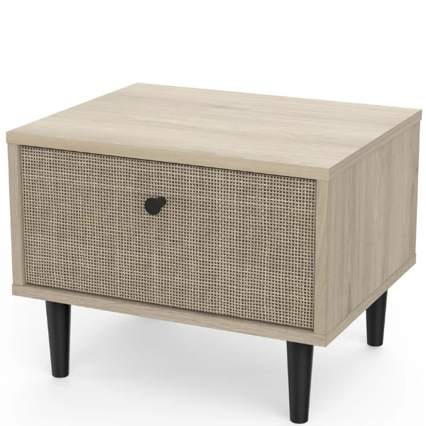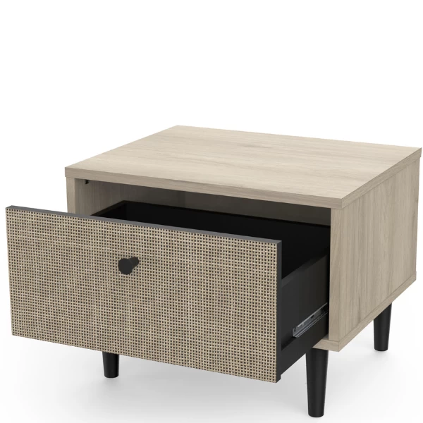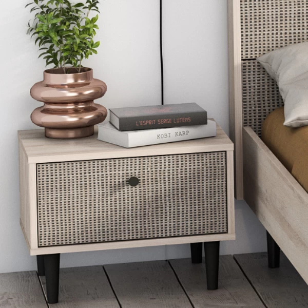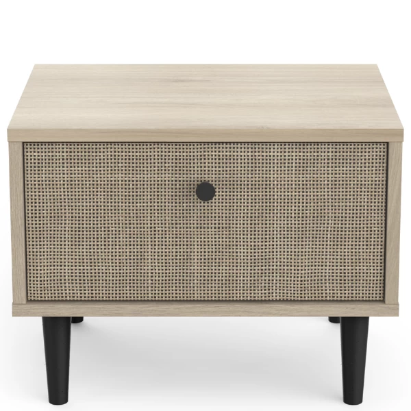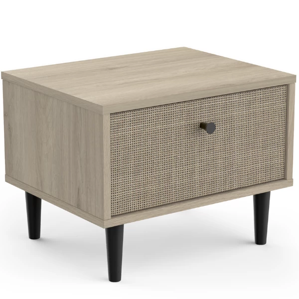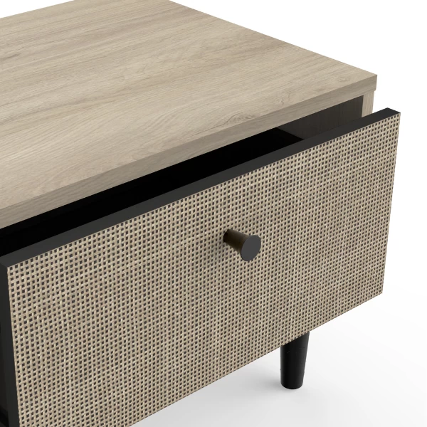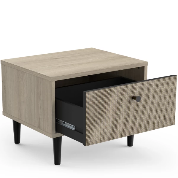 Fan du style japandi ? Alors cette table de chevet est faite pour vous! L’aspect naturel du décor osier associé à la douceur du décor chêne kronberg crée de la sérénité dans la chambre à coucher. Le bouton de porte et les pieds noirs témoignent de la simplicité et de l’élégance. Cette armoire est équipée d’un tiroir pour ranger des mouchoirs, des médicaments, des bijoux et d’autres petits objets. Combinez-la avec les autres meubles de la collection Sayuri et créez votre chambre à coucher Japandi !