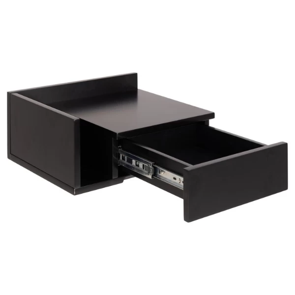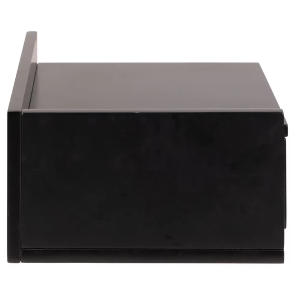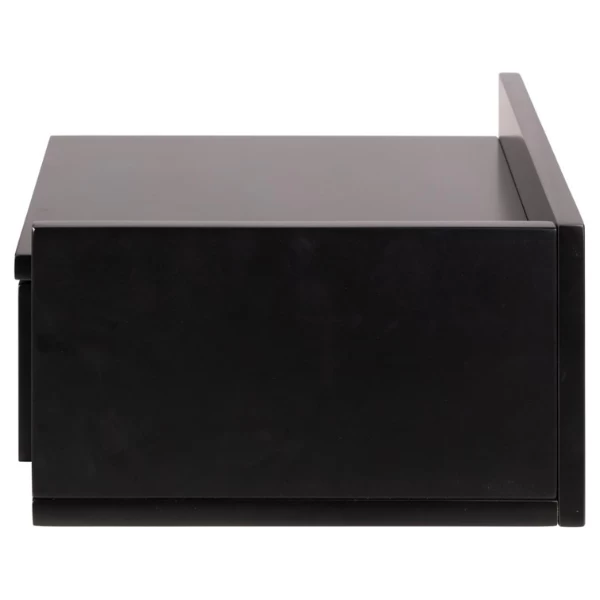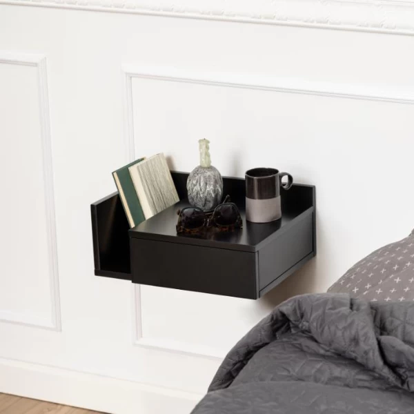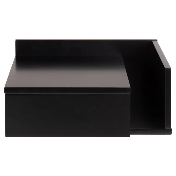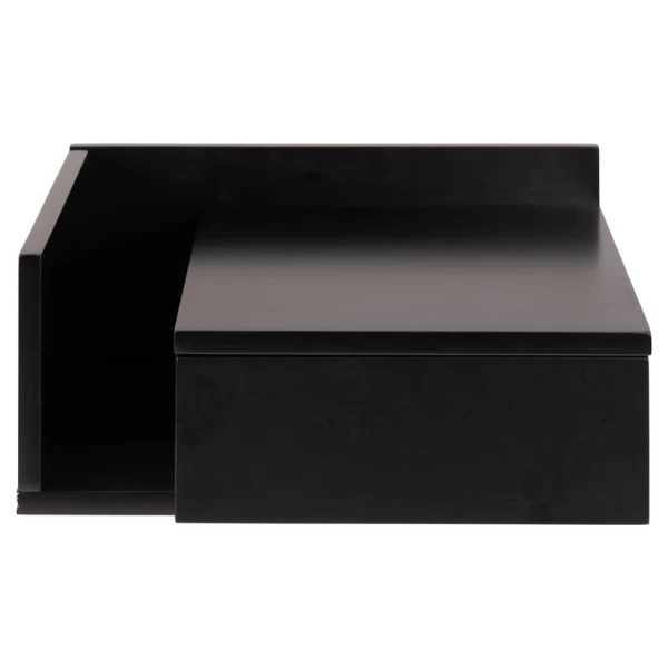 Petit, mais assez grand. La table de chevet Ashlan a un design compact (40x32x16,5 cm), mais offre suffisamment de place pour un livre, une veilleuse, des lunettes de lecture… Comme la table de chevet Ashlan est flottante, vous perdez moins d’espace et vous pouvez déterminer vous-même la hauteur de votre table de chevet. Vous préférez ne pas avoir l’espace ouvert sur le chevet du lit ? C’est possible, pendant le montage, vous décidez de quel côté sera l’espace ouvert. La table de nuit murale Ashlan est fabriquée en MDF laqué noir.