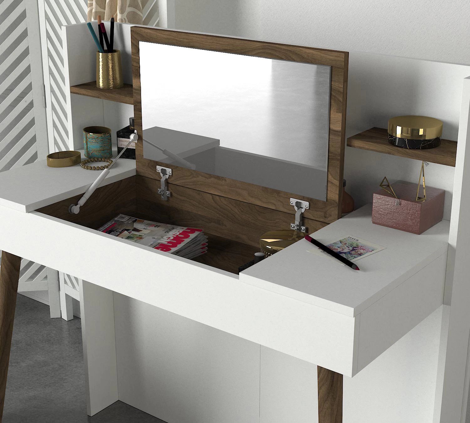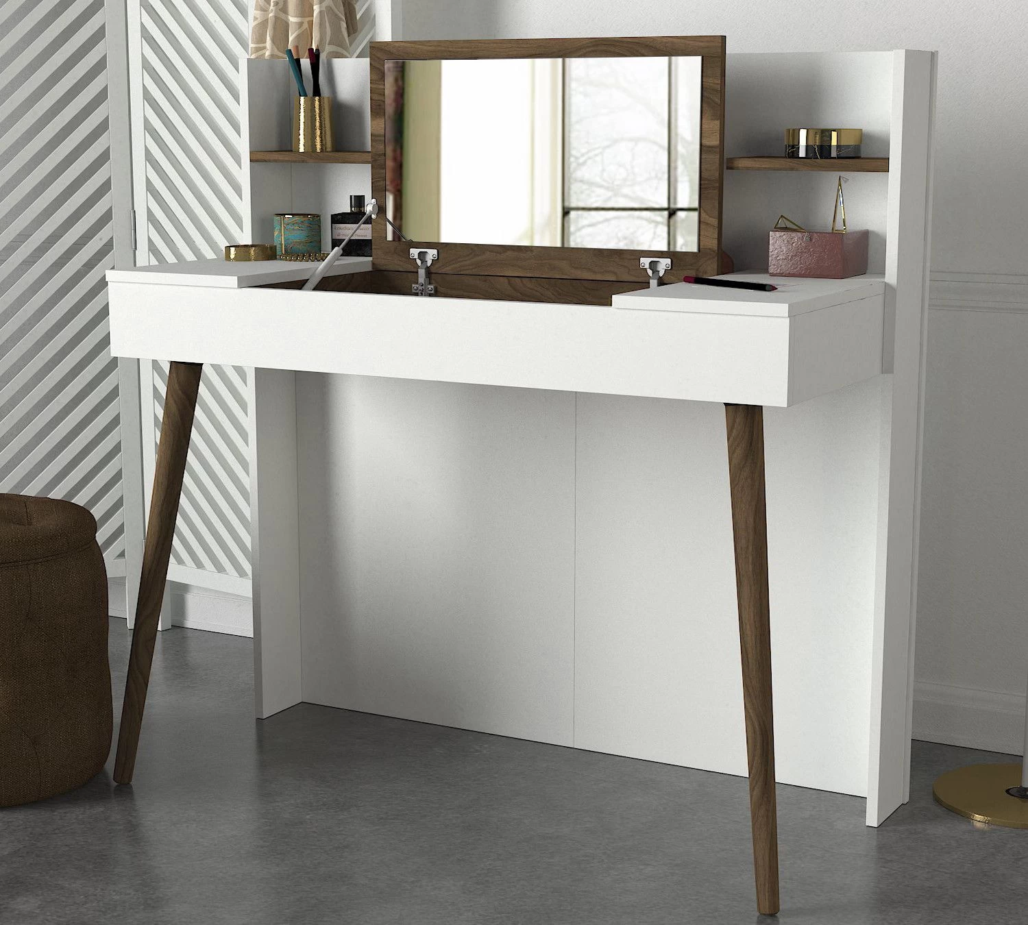 La table de maquillage Tera Home est livrée avec un miroir, qui vous permet d’appliquer facilement votre maquillage avec précision et confiance. Le miroir est judicieusement positionné pour offrir une visibilité optimale, ce qui vous permet de créer des looks parfaits à chaque fois. Que vous vous prépariez pour une soirée ou pour une journée bien remplie, ce miroir sera votre meilleur compagnon.