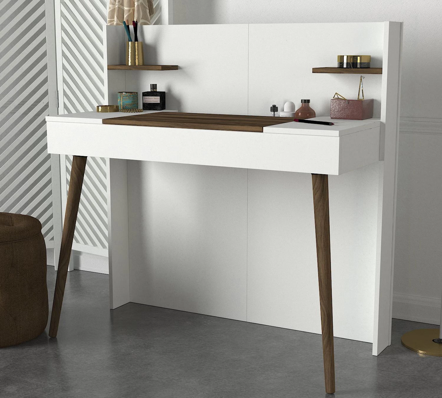 Les pieds en bois tournés ajoutent à l’élégance de cette table de maquillage. Fabriqués avec une attention méticuleuse aux détails, ces pieds rehaussent l’esthétique générale, donnant à la table une touche de sophistication. La couleur Walnut White ajoute une touche de grâce intemporelle à n’importe quel espace, se fondant sans effort dans le décor existant.