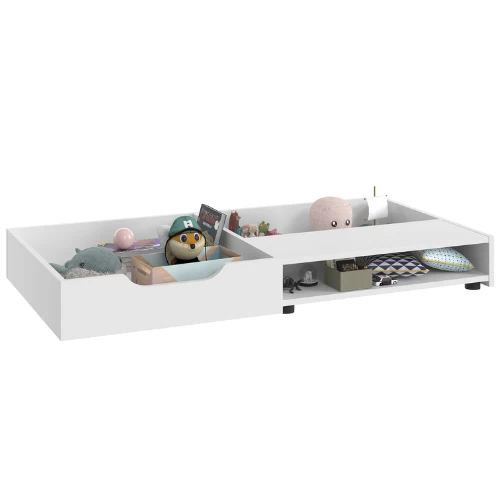 Une chambre d’enfant intemporelle, voilà ce que vous pouvez obtenir avec les meubles de la collection Binno en panneaux de particules. La combinaison du décor de chêne et des surfaces blanches est à la fois élégante et chaleureuse. Le tiroir de rangement blanc s’adapte sous le lit d’enfant de 70 x 140 cm et a de nombreuses fonctions différentes. Vous pouvez l’utiliser pour ranger le linge de lit, les livres ou les jouets, mais elle peut aussi servir de table de chevet. Le tiroir glisse facilement sous le lit grâce à ses roulettes.