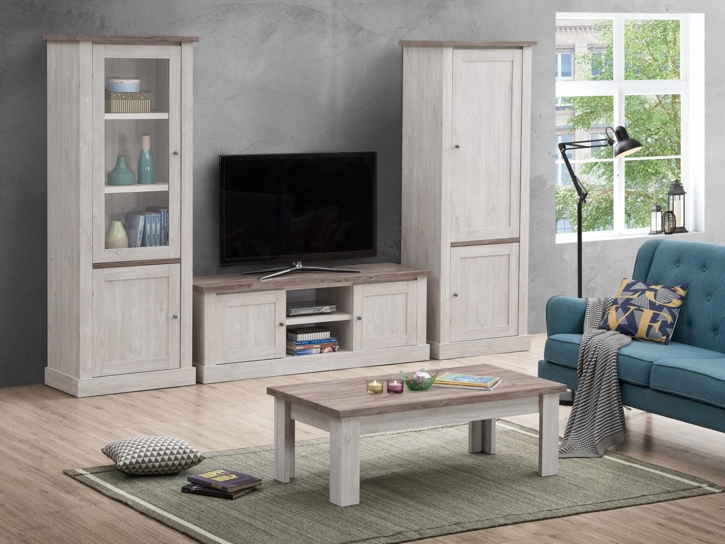 Les meubles Elayza s’inspirent du style de la campagne. Ils sont fabriqués à partir d’aggloméré avec un décor en chêne blanc. Ce meuble comporte également des détails en décor chêne gris, pour ajouter un peu de contraste au meuble.